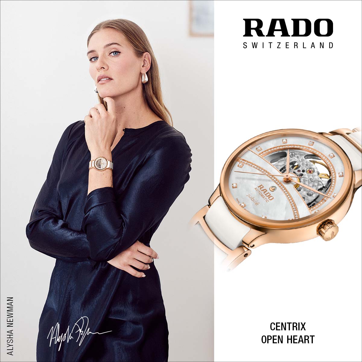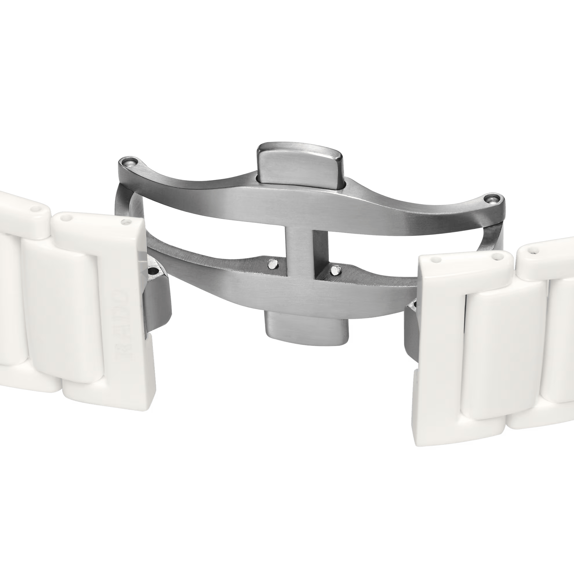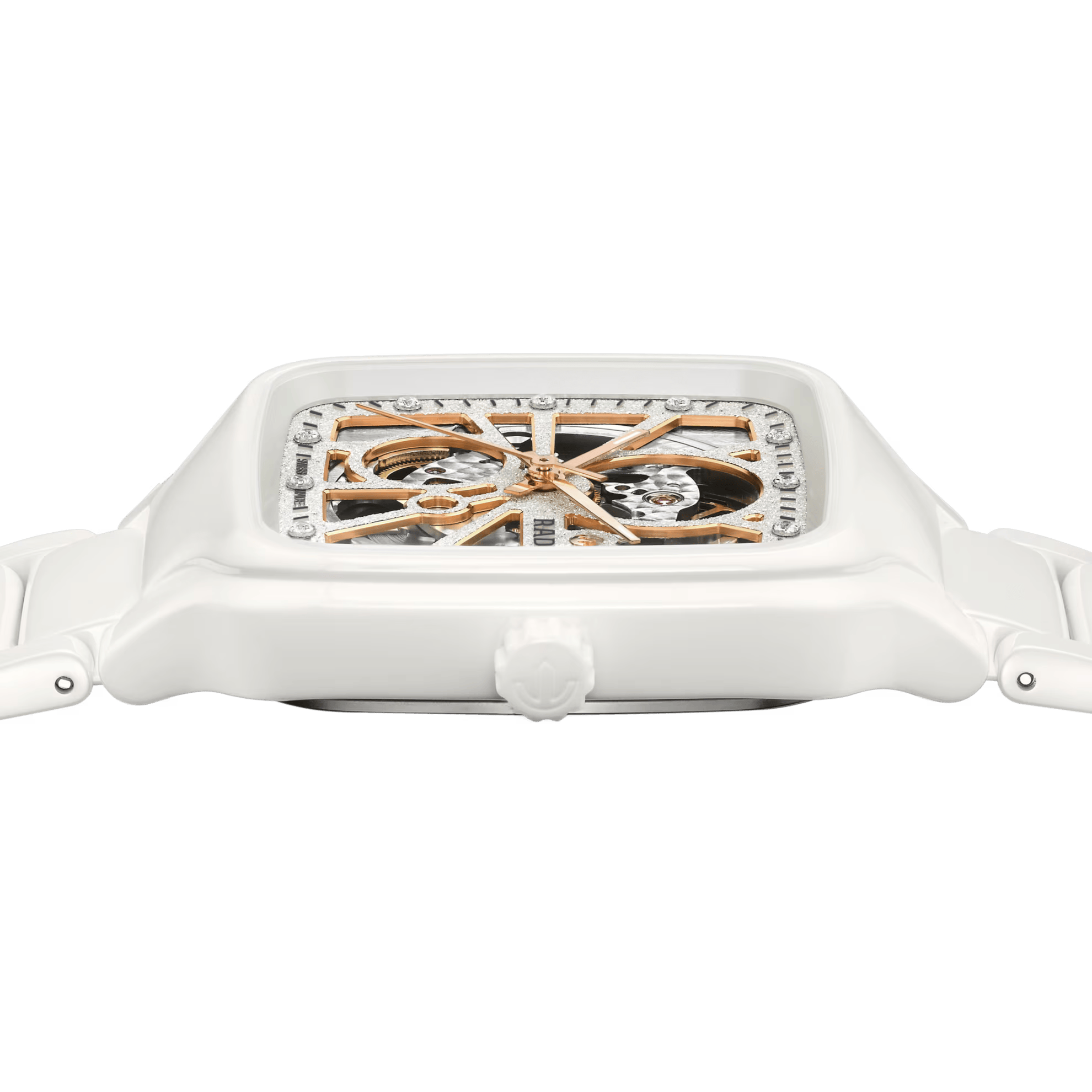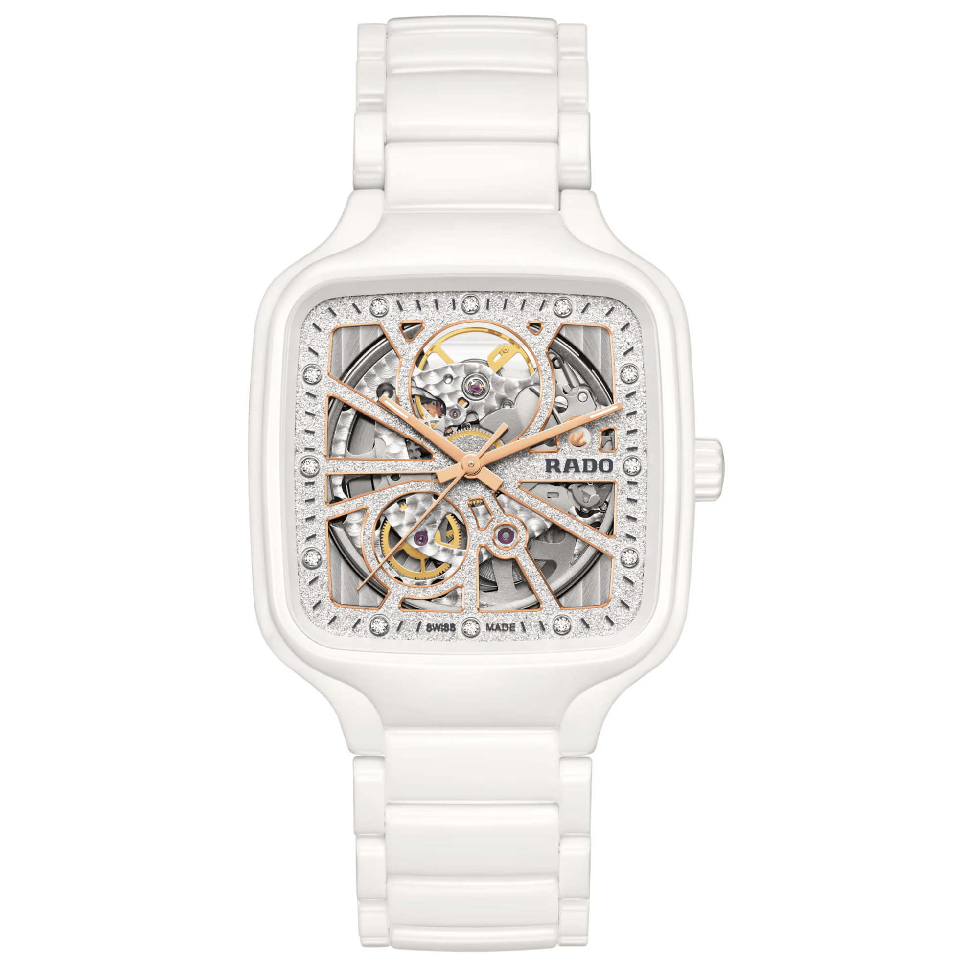 Top-class diamonds and a sparkling dial bring a fresh look to this dazzling True Square Open Heart. The iconic square case and bracelet in polished white high-tech ceramic frame an innovative new dial with a rhodium-coloured diamond powder-like finish. A unique electro-forming process produces the dial’s diamond-powder-like glitter and permits the Rado logo, markings and minute tracks to be raised in sharp relief from the base of the dial, the result of galvanic growth. The 12 jubilé diamond indexes, rose gold-coloured hands with Super-LumiNova®, and the intriguing cut-away design reveal the Rado calibre R734 with an 80-hour power reserve.