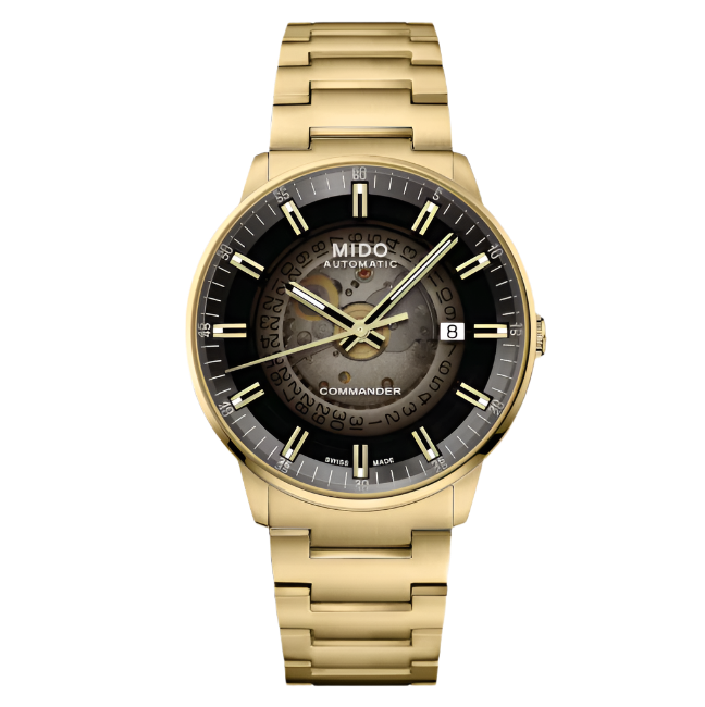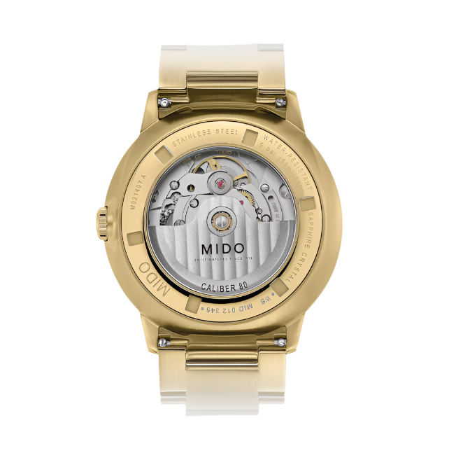 At the heart of this watch beats the trusted Mido Automatic ETA movement, the Caliber 80, providing an impressive autonomy with its 80-hour power reserve. The beauty of this movement is visible through the open case back, highlighting Mido's fine craftsmanship.