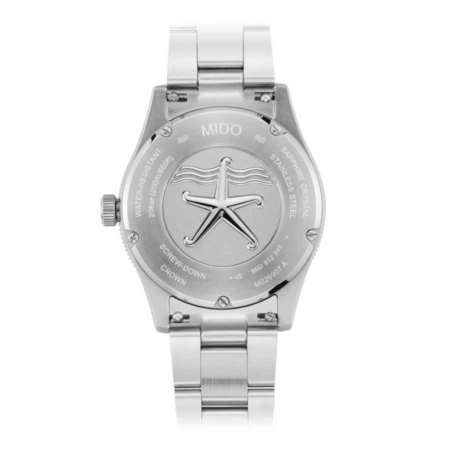 Get set for an adventure – on land or across the ocean, but always in great style! MIDO proposes what is undeniably its most versatile Ocean Star watch model, a sporty, reliable and chic companion for any escape. Its perfect 39 mm diameter, is combined with a beautifully slim case for the Ocean Star. The aesthetic of this automatic watch is defined as well by its unique and distinctive relief dial – evoking the movement of the currents across the sand. Water-resistant up to a pressure of 200 m (20 bars / 660 ft), the famous starfish motif - emblem of MIDO's historic watchmaking expertise in water-resistance - is featured on its screw-down case back.