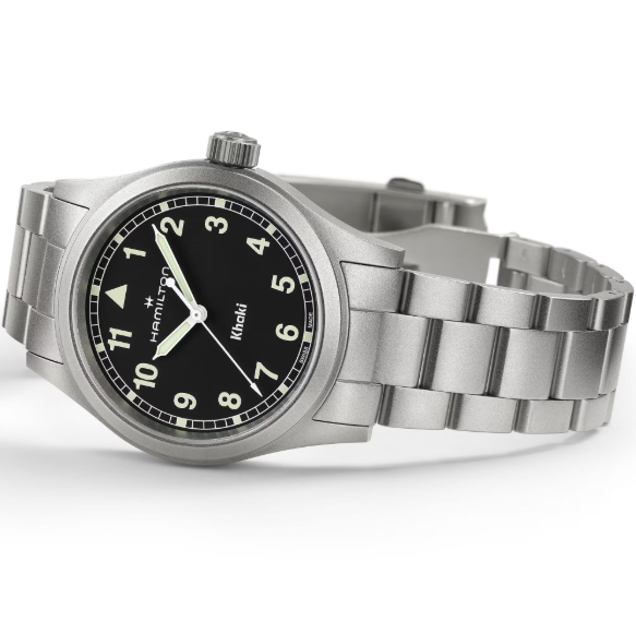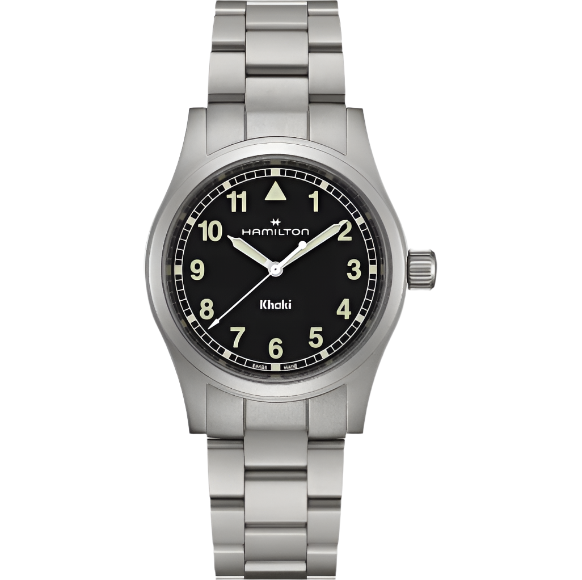 Always a reliable and sturdy choice for your next adventure, the Hamilton Khaki Field Quartz embodies Hamilton's commitment to precision, innovation, and practical design. It features a timeless 38mm black dial paired with a modern metal bracelet, ensuring it's ready when you are
