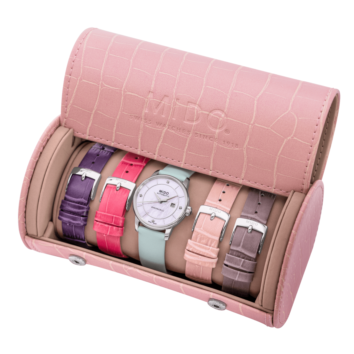 The Baroncelli Signature Lady Colours special edition, introduces an array of colourful and feminine notes. The 30 mm-diameter case can be completely transformed whenever its wearer desires thanks to five different, easily interchangeable leather straps that simply click into place. Four diamonds sparkle on its iridescent white mother-of-pearl face. Its mechanical heart keeps time with the keenest of aspirations thanks to its excellent accuracy and impeccable reliability, enhanced by a Nivachron™ balance-spring.