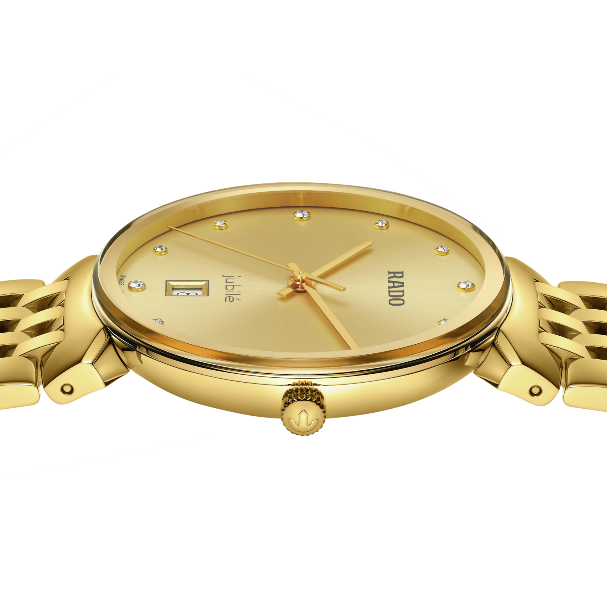 The harmonious design of the Rado Florence calls to mind the elegant domes and towers of the city from which the collection takes its name. Powered by a reliable three-hand Quartz Rado calibre R073 movement, this watch ensures greater accuracy and resistance to shocks. The 38 mm watch has an edge-to-edge-bevelled, curved sapphire crystal. The watch boasts a polished yellow gold coloured PVD coated stainless steel case, crown, bezel and case back. The bracelet made of polished yellow gold coated stainless steel completes the overall appearance of this classic timepiece. The yellow gold dial with 12 diamonds, emphasised with the printed “jubilé” logo, matches perfectly with the yellow gold coloured hands. The watch is water resistant down to 50 m and is also available in S size, which makes it an ideal couples’ watch.