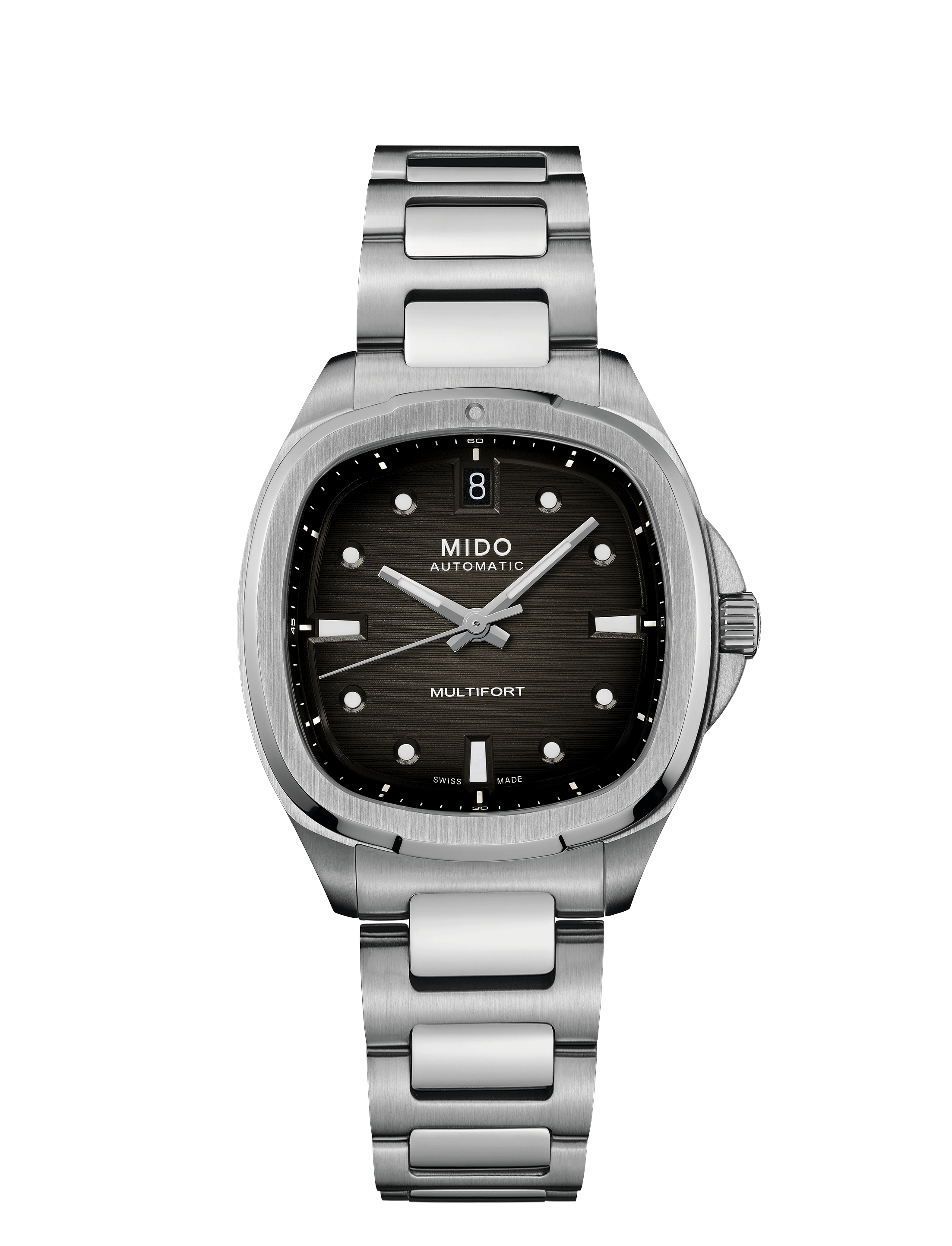 MIDO is adding a size to the successful Multifort TV collection. Without losing any of its cult TV-shaped silhouette, the Multifort TV 35 - with its size of 35 x 34.2 mm - makes a remarkable debut in a fascinating version with perfectly versatile dimensions. A distinctive feature: its thickness is reduced to the maximum, thanks to its Calibre 72 automatic movement, renowned for its finesse and outstanding reliability granted by a high-tech Nivachron balance spring. The unique allure of this model will appeal to all wrists in any dial combination, offering a sublime blend of the collection's signature design elements.