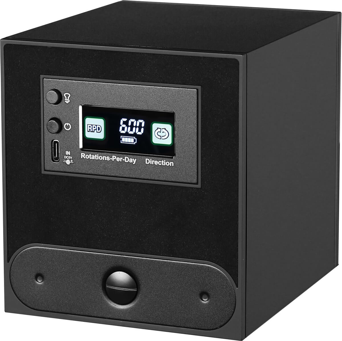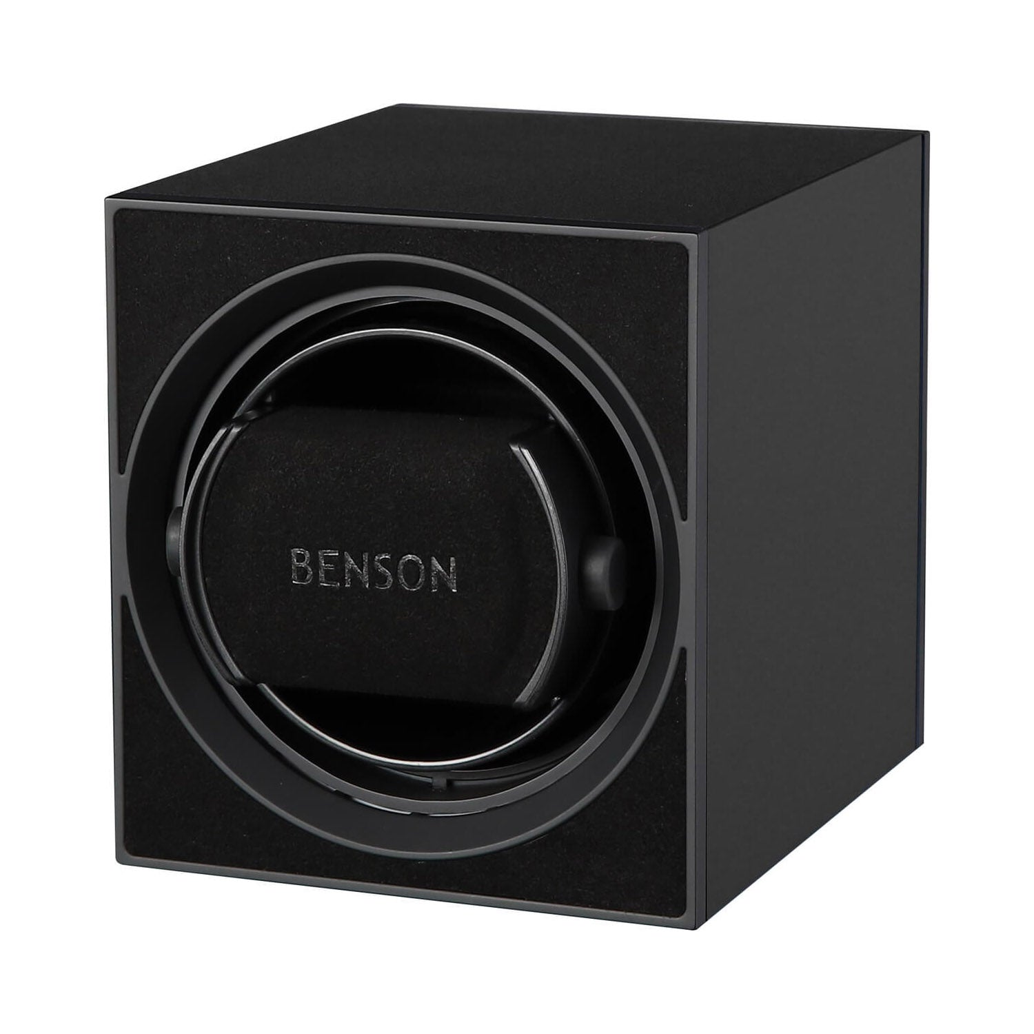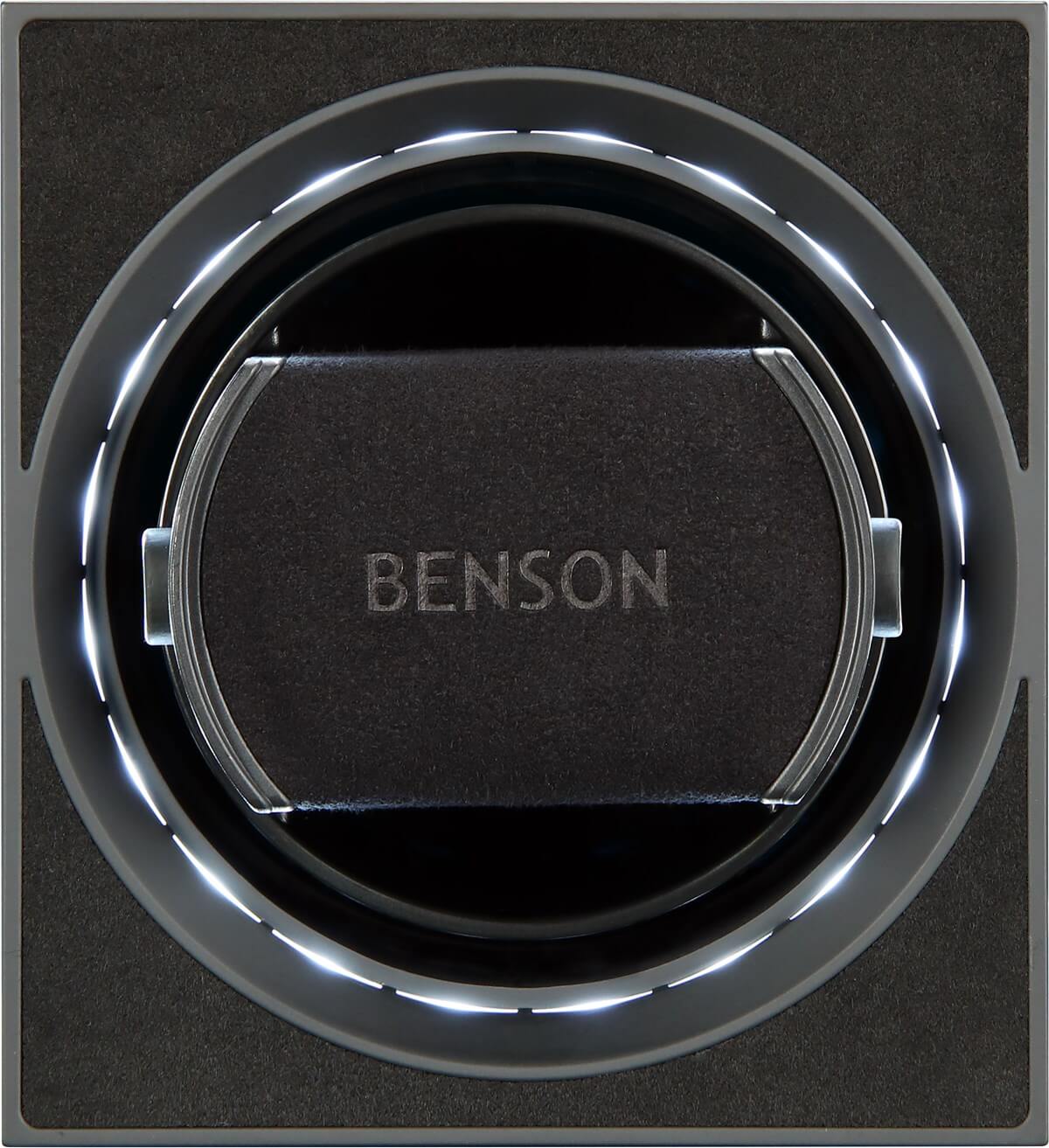 Benson proudly presents its latest generation of Compact Aluminum watch winders. This new series of watch winders has a modern design, is compact and contains excellent features. These new Benson Compact Aluminum watch winders provide any automatic watch, regardless of brand or model, with sufficient energy completely safely and easily so that the watch is immediately ready to wear. The advantages of the Benson Compact Aluminum watch winders are the excellent price/quality ratio, high functionality and beautiful finish. Each model can be fully configured in terms of direction of rotation and number of revolutions per day. In addition, an important advantage is that this Benson Compact Aluminum 1 Black watch winder functions for +- 6-9 months on one set of batteries. The flexible watch holder ensures that large but also smaller watches click into place in the watch winder for optimal safety of the watch. The special LED lighting ensures that you can also see
