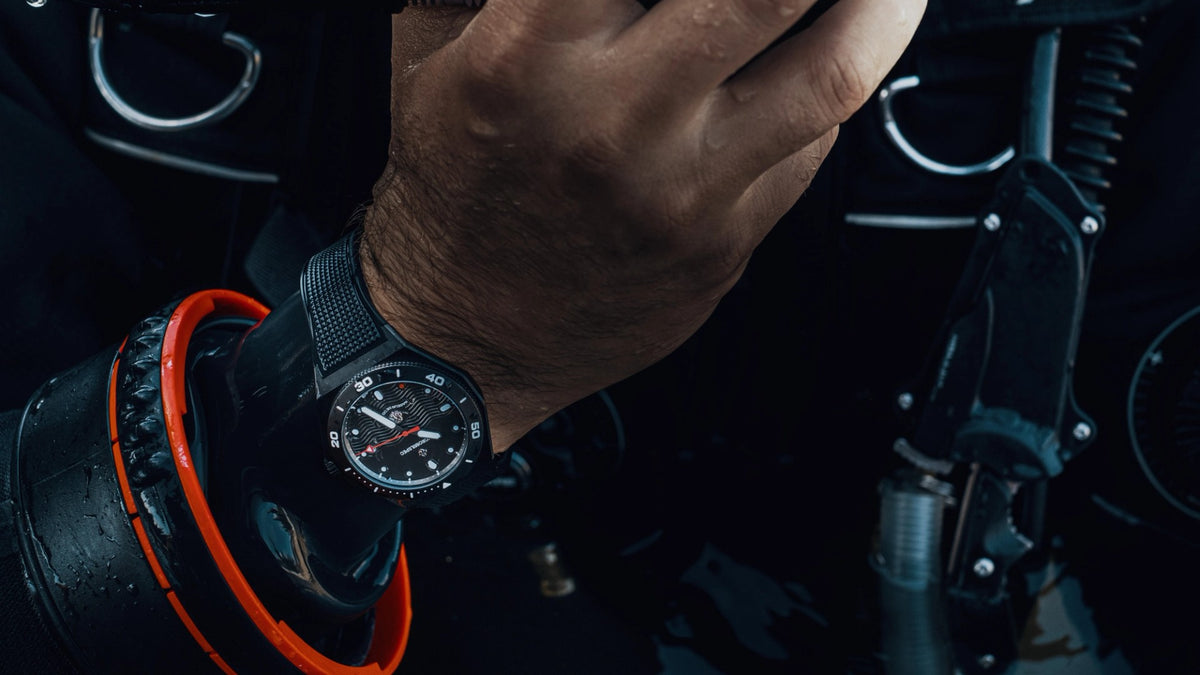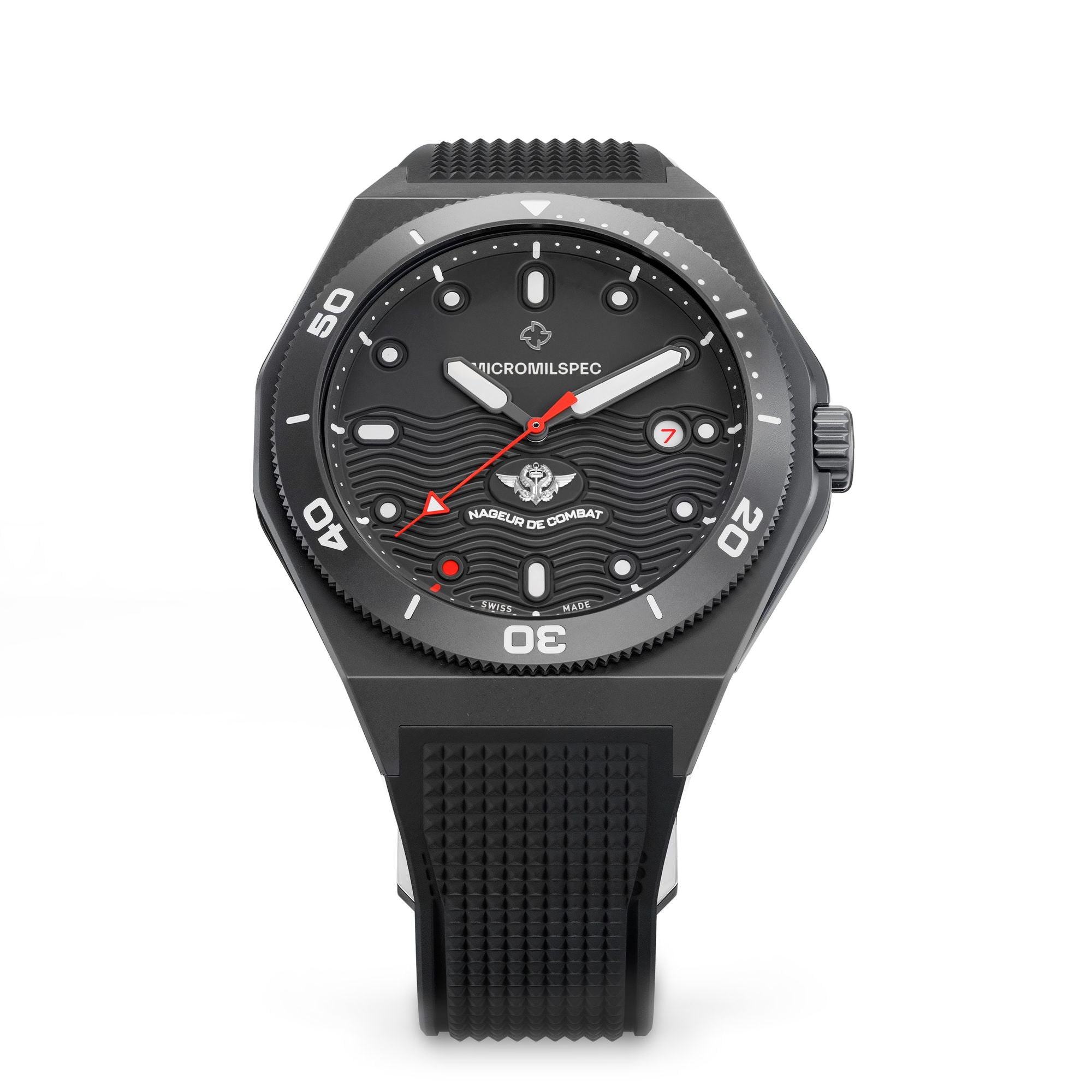 Features red details on the seventh hour and date as a reminder of the maximum diving depth with a rebreather using 100% O2. PVD coated and micro blasted stainless steel case, integrated straps, chamfered crown guard, screw in crown and sapphire crystal.