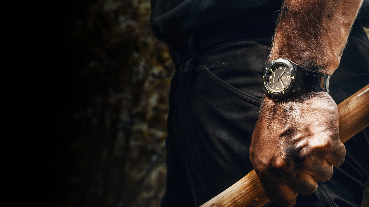 Executed in a matte dark finish. PVD coated and micro blasted stainless steel case, integrated straps, chamfered crown guard, screw in crown and sapphire crystal. Self glowing yellow signal colour on bezel, dial and hands in top grade SuperLuminova X1.