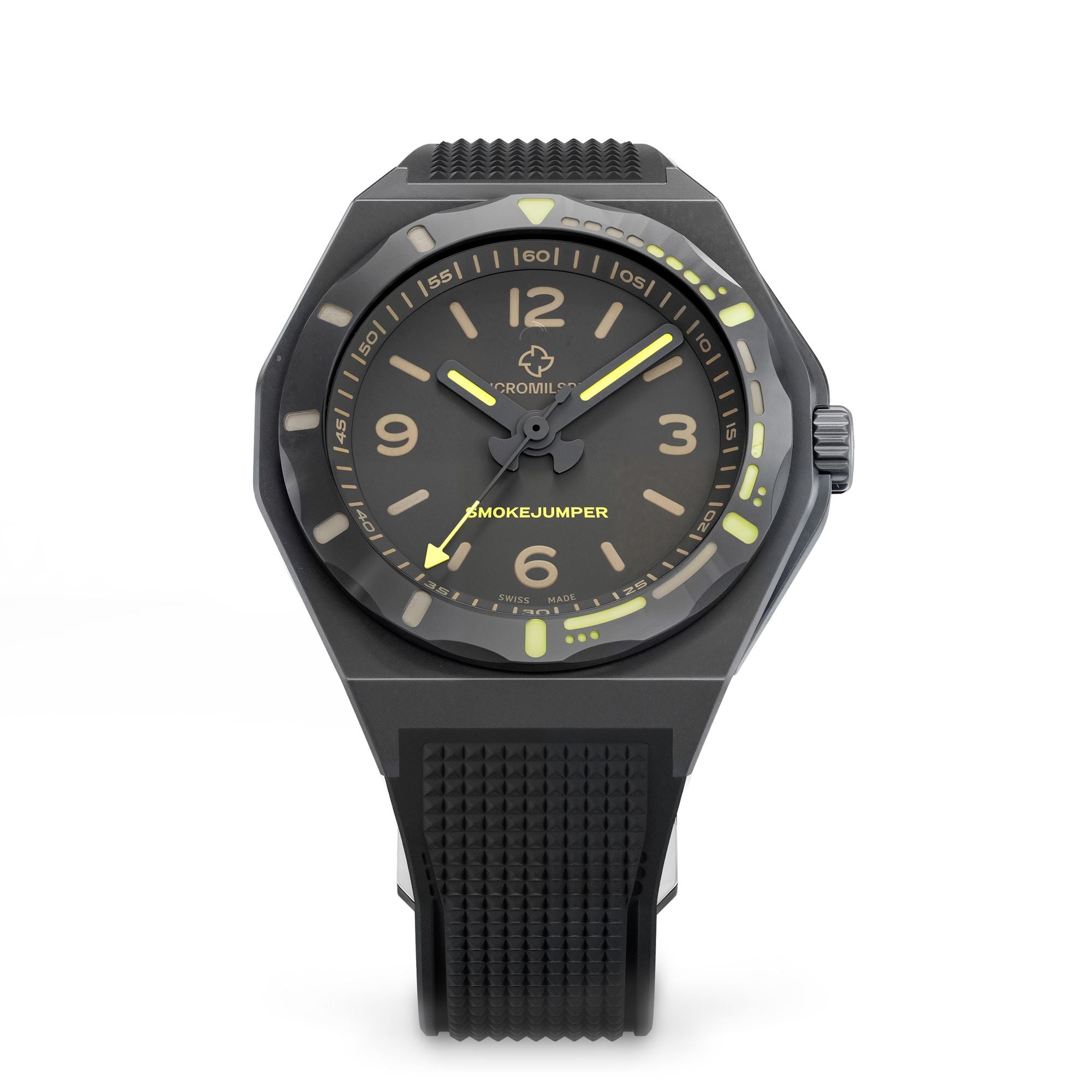 Limited to 200 pieces annually: This unique timepiece takes design cues directly from the mechanical manometer display on oxygen tanks – perfect for those "top up" moments or entering smoke-filled environments. Featuring a bold smokejumper colorway, celebrating the critical duties that inspired it. Firefighter professionals are eligible for a custom version.