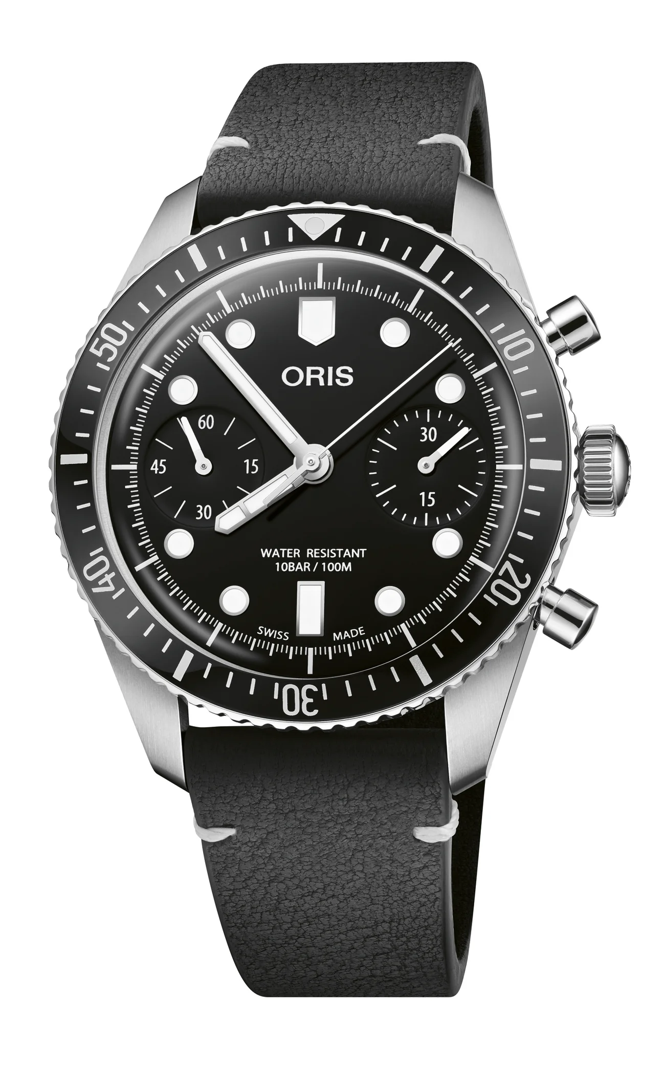Oris is pleased to introduce a fresh expression of the mid-century-inspired Divers Sixty-Five Chronograph, our ever-popular retro diver’s watch. The new model has a smaller 40 mm case and a refined monochromatic dial design and comes with the option of a black leather strap crafted in sustainably sourced deer leather by our Swiss partner Cervo Volante or a stainless steel metal bracelet.