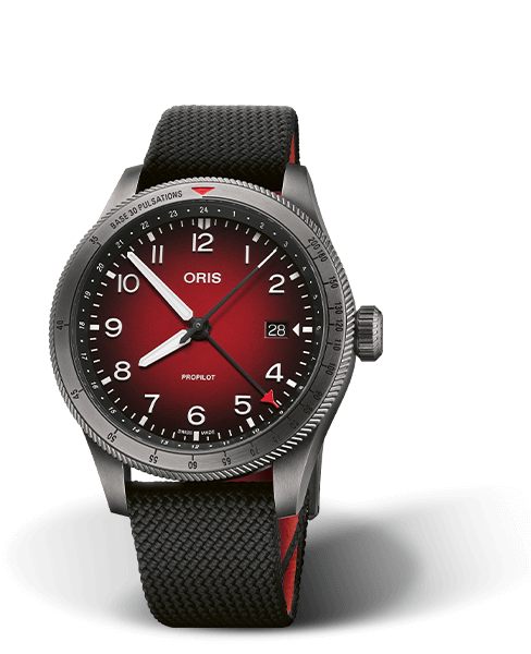 Oris is delighted to announce the return of the ProPilot GMT, the watch for high-flying, timezone-crossing pilots. The new model features a stealthy grey-PVD-plated stainless steel 41.5 mm case, a second time zone, a pulsometer scale and a punchy gradient red dial.