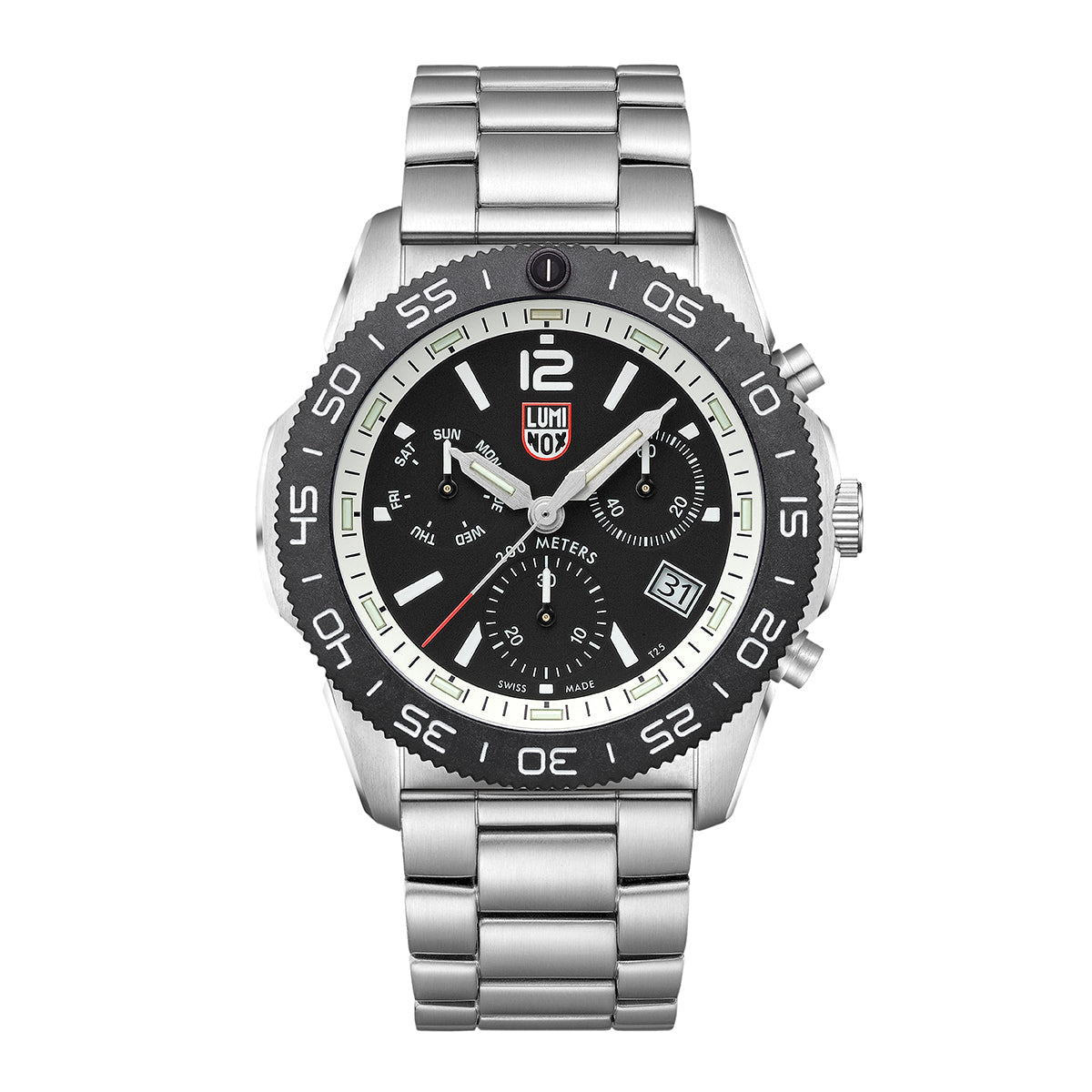 This sleek and sporty design boasts a 44mm stainless steel case with a CARBONOX™ unidirectional bezel, a vital instrument for any diver. The chronograph with a black dial, three tone-in-tone sub dials and a navy dial ring features a 316L stainless-steel strap with a quick release system – allowing for an easy and perfect fit. As with every other Luminox timepiece, this Pacific Diver incorporates Luminox Light technology, making sure that your timepiece is visible in any condition for up to 25 years.
