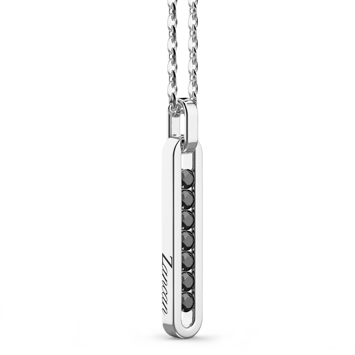 Zancan 925 silver necklace with tag pendant. The elongated, narrow, oval-shaped pendant has a hollow central section into which seven shiny black spinels have been set. A necklace with a minimal style embellished with details that assure a powerful impact on the viewer.