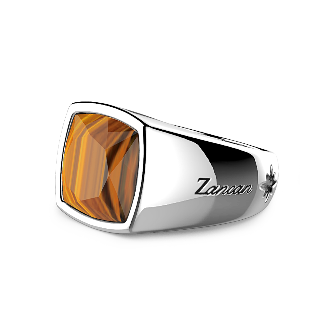 Zancan 925 silver ring. A shiny square brown tiger's eye measuring 12x12 is set into the top. The colors of this unique stone shift depending on the angle from which it is viewed. The shanks feature a polished finish. The piece is a part of the Cosmostone collection, characterized by sparkling natural stones. The ring is completely crafted by hand in Italy and weighs 12.00 g.