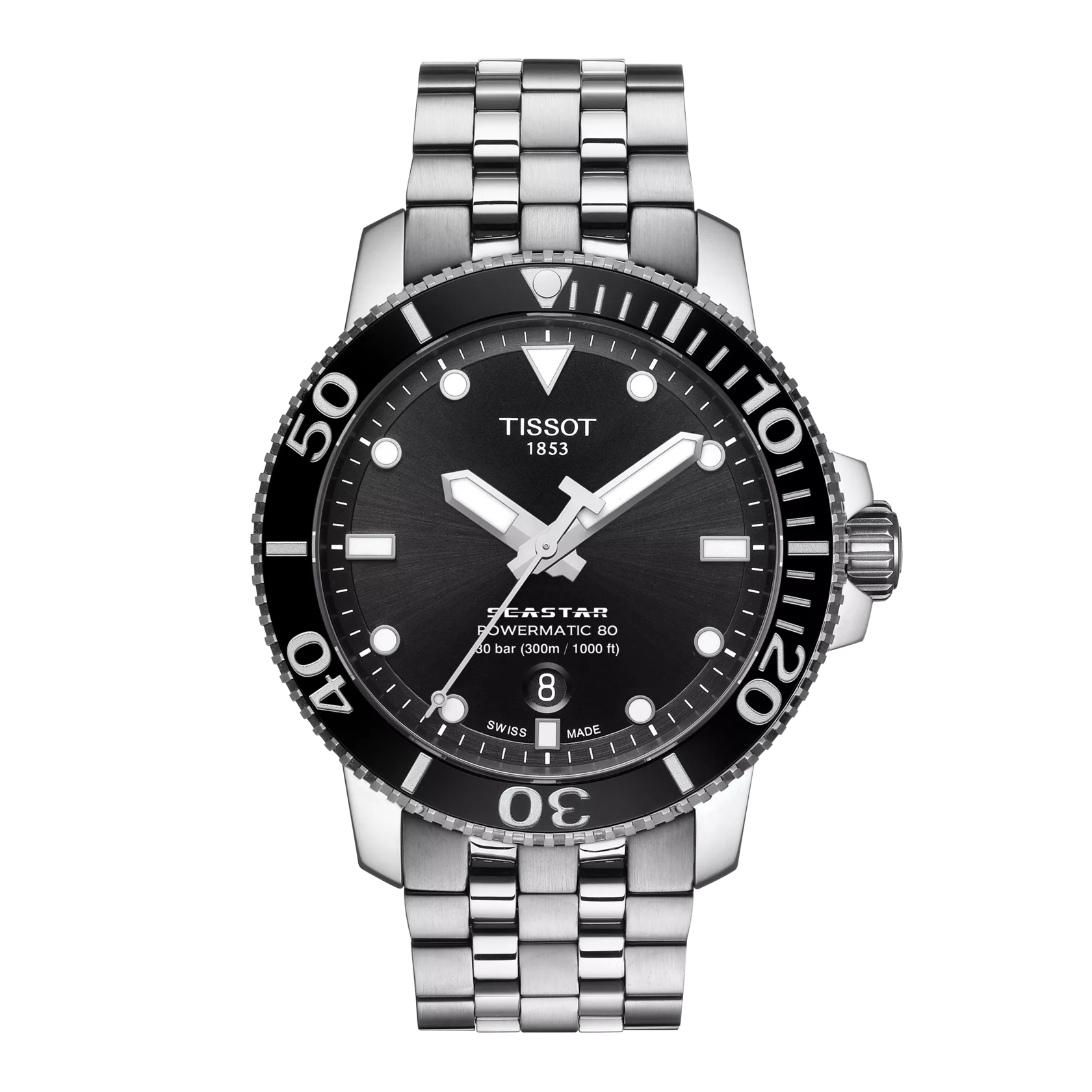 The Tissot Seastar 1000 with bright details and ceramic bezel merges style and performance without diluting either. The water-sport inspiration shapes both the appearance and the functionality of this watch. It maintains its performance underwater to a pressure of 30 bar (300 m / 1000 ft). Combining high-performance with style, the Tissot Seastar 1000 will be loved by water-sports lovers. Now combined with the energy of the Powermatic 80 automatic movement for up to 80 hours of autonomy.