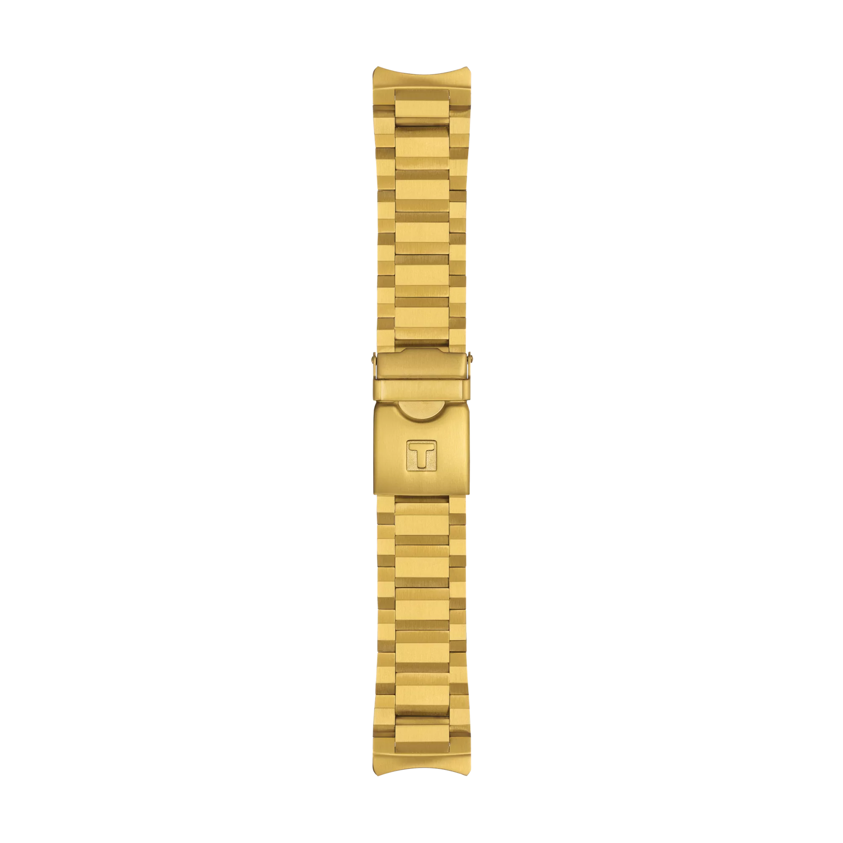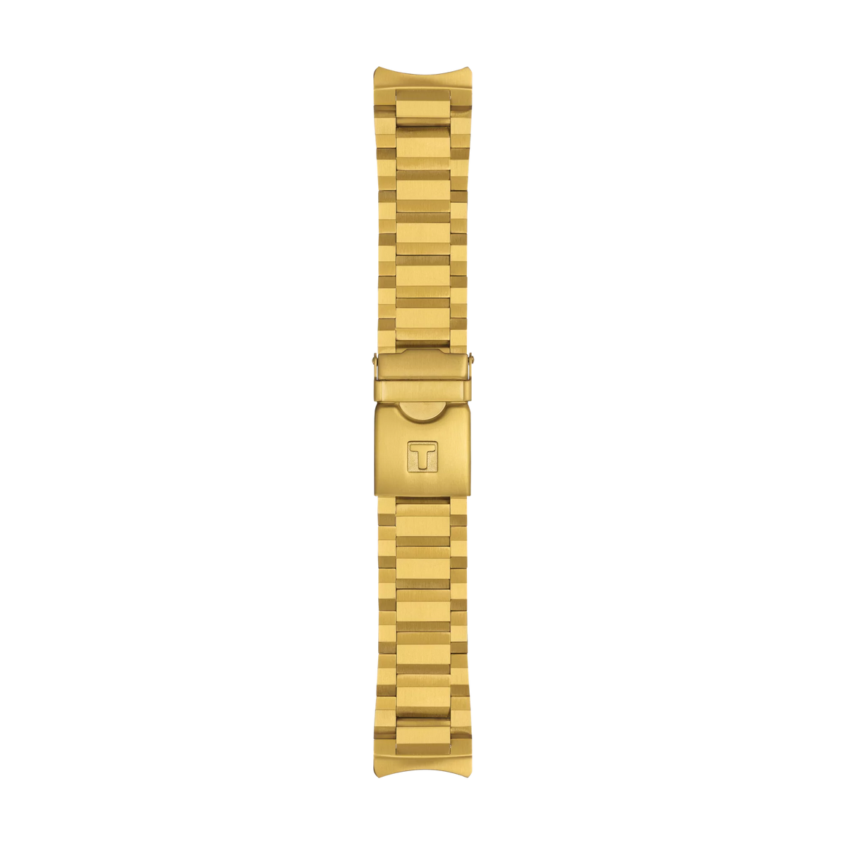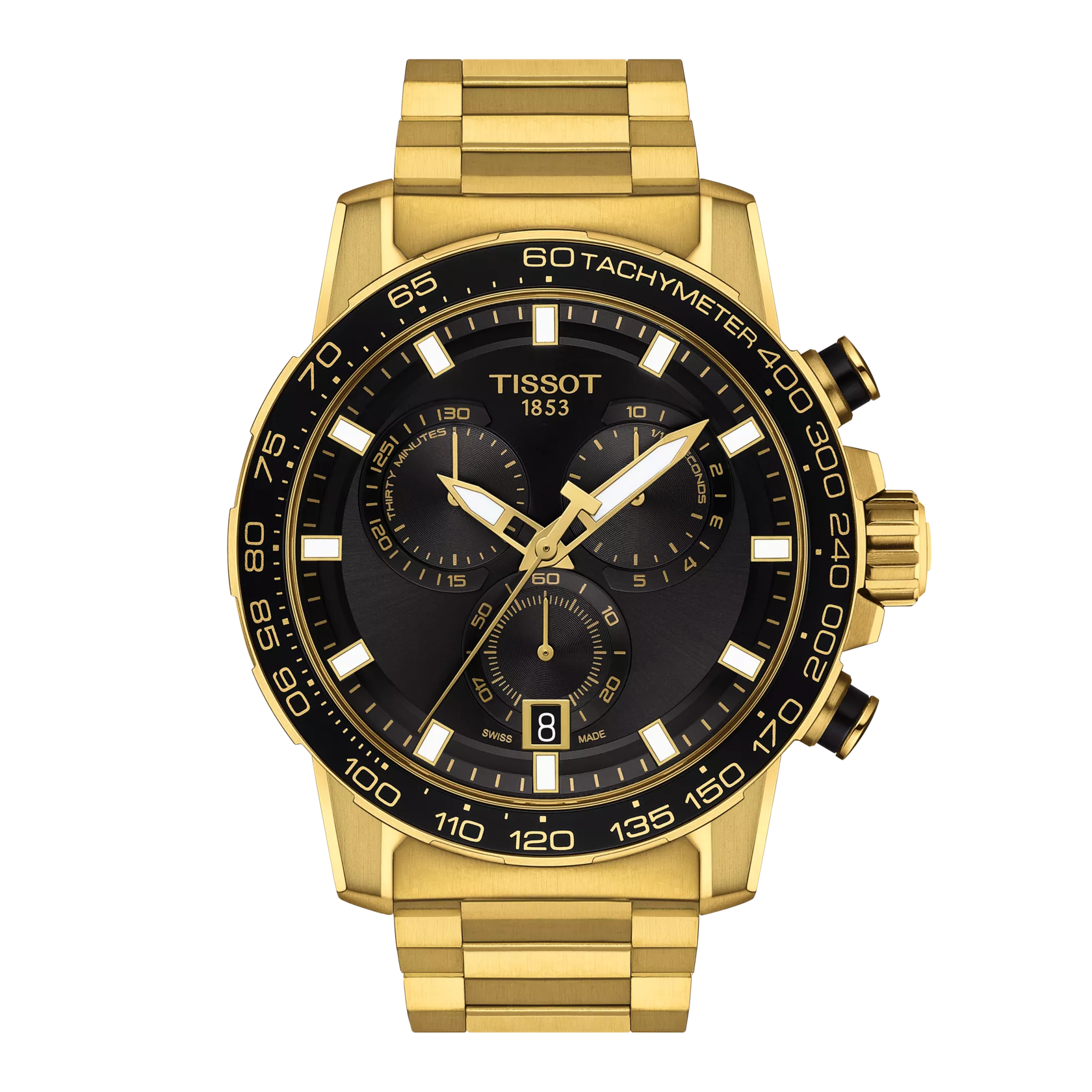 This version of the Tissot Supersport Chrono features a Swiss Made quartz movement and a 316L stainless steel case with yellow gold PVD coating. The black dial with date display is contrasted by yellow gold hands and hour markers. The 316L stainless steel bracelet, also coated with yellow gold PVD, features a quick release system. It's easy to switch your strap and change styles.