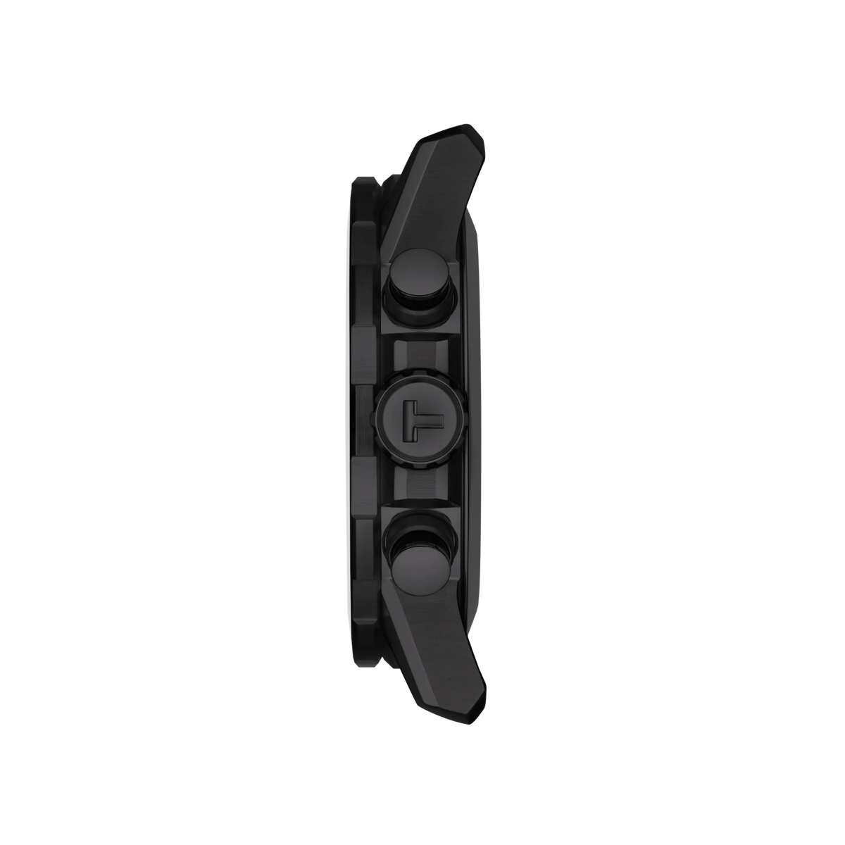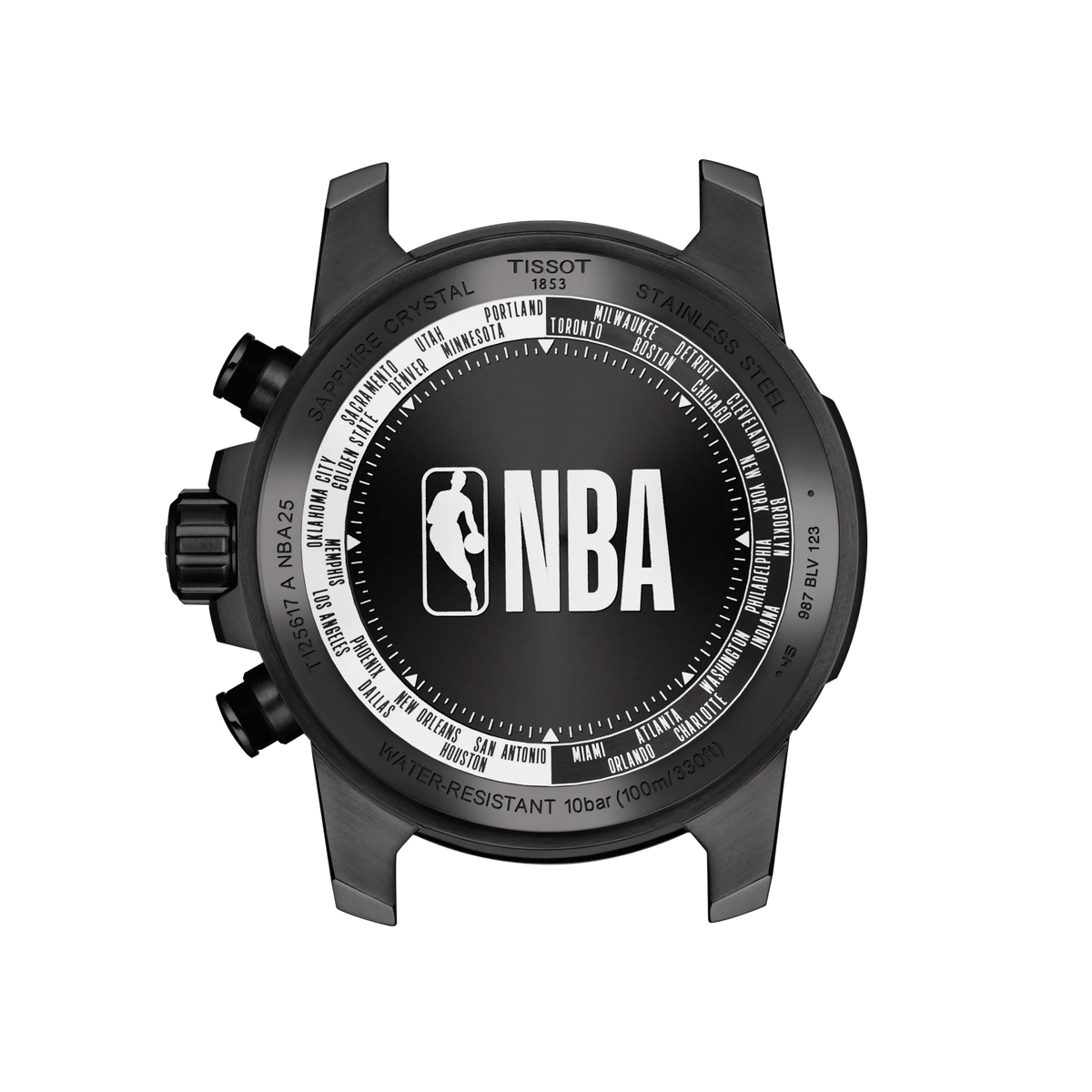The NBA Supersport Special Edition honours basketball with thoughtful details and a sporty style. The striking 45mm black PVD-coated stainless steel case features a bezel incorporating the 24 seconds rule drawing from the NBA’s shot clock with colour accents hinting at the league. The dial, featuring a basketball dot pattern and a gradient fade from dark grey to black at the edges, creates an illusion of depth that mirrors the shape of the ball. Numeral indexes, like those on player's jersey, add a meaningful touch, while the NBA logo on the second hand serves as a further tribute to the sport. The black bi-material bracelet complements the dial's texture, making it perfect for everyday wear and physical activities. Meanwhile, the case back holds the true hidden gem: intricate engravings of the NBA logo, surrounded by the cities and states the teams take their names from, both the Western and Eastern Conferences. This watch features a quartz chronograph movement, providing accurate timekeeping with minimal maintenance.