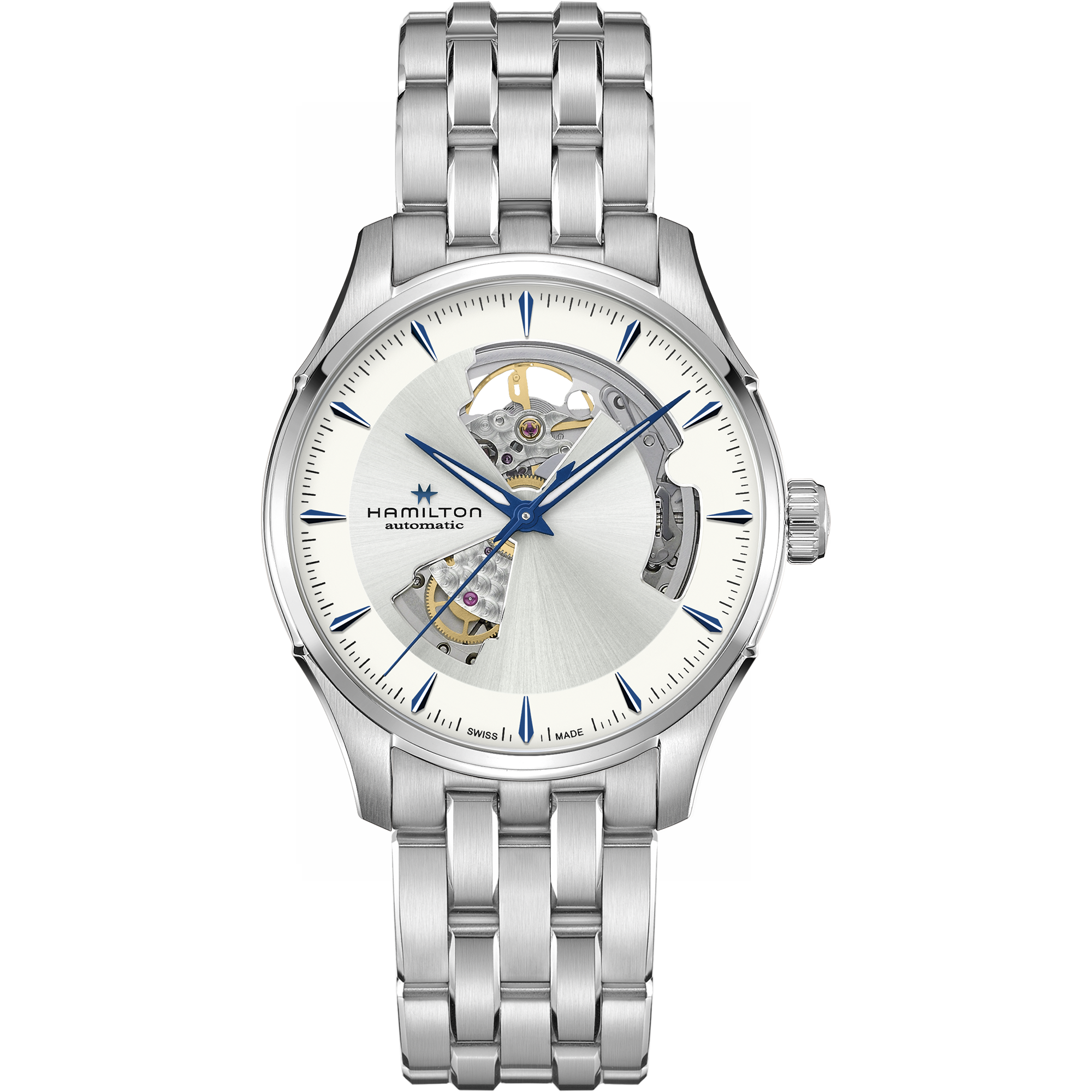 Classic watchmaking meets contemporary design in this blue and silver Jazzmaster Open Heart Automatic. Precision cutouts in its 40mm dial offer a glimpse at the Swiss-made movement inside and give this sophisticated timepiece a powerful personality all its own.