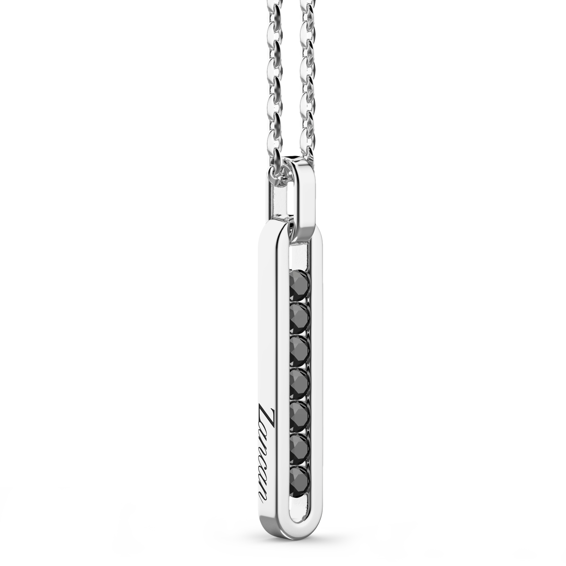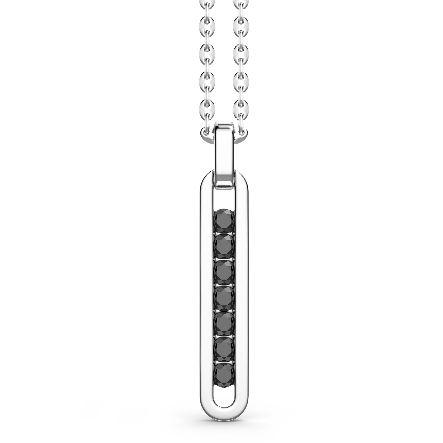 Zancan 925 silver necklace with tag pendant. The elongated, narrow, oval-shaped pendant has a hollow central section into which seven shiny black spinels have been set. A necklace with a minimal style embellished with details that assure a powerful impact on the viewer.