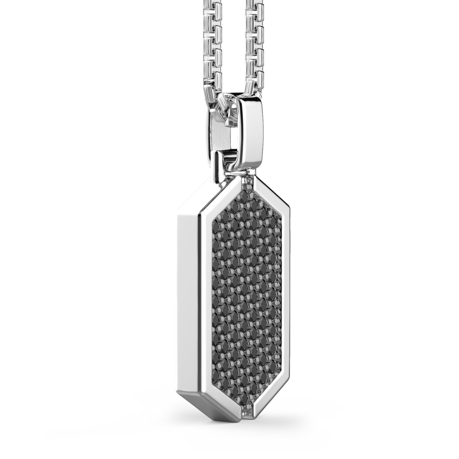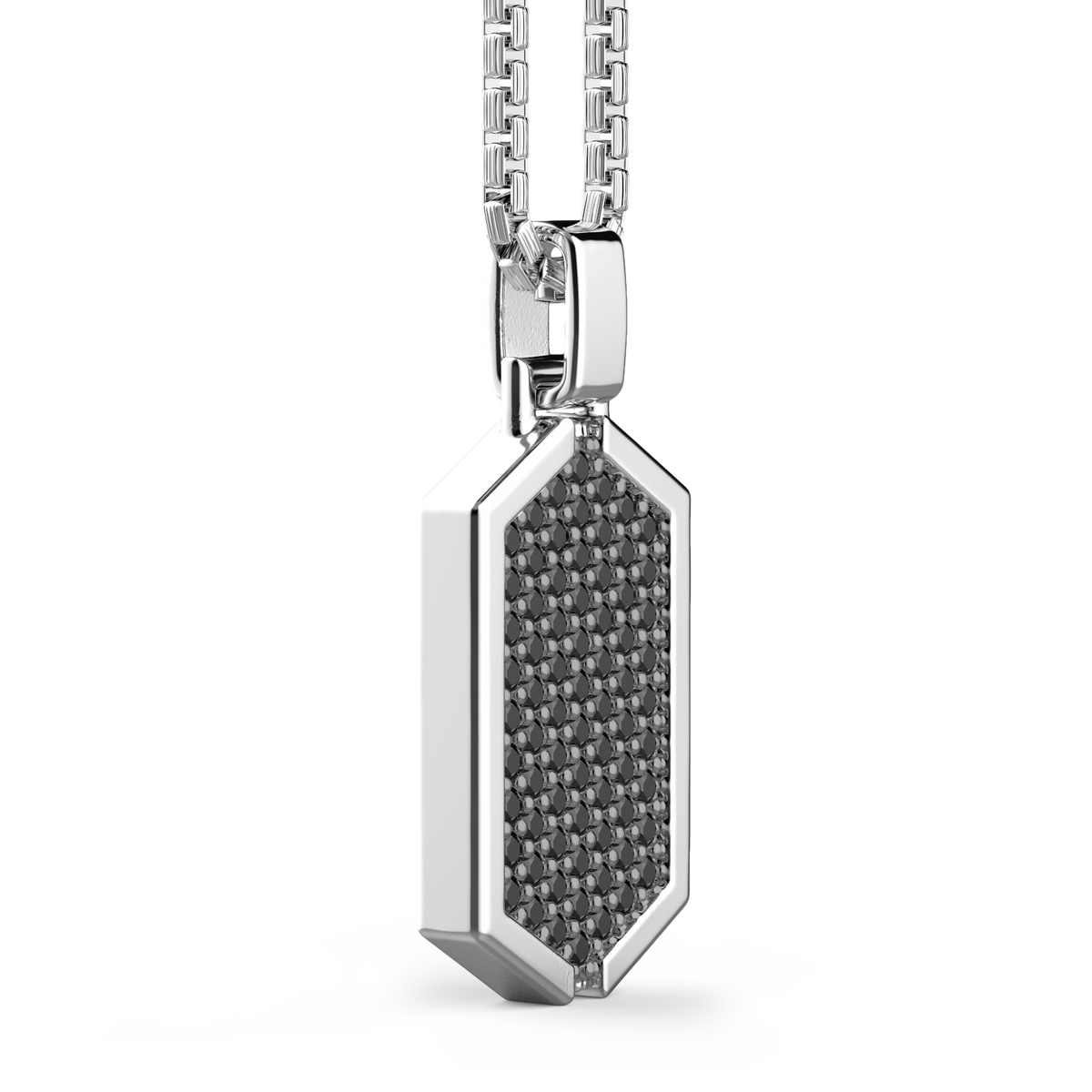 Zancan 925 silver necklace. This hexagonal tag pendant is studded with black spinels. A contemporary reworking of a classic Zancan piece of jewelry. The necklace is part of the Cosmopolitan collection, inspired by fast-paced contemporary city life. The piece is fully made by hand in Italy, weighs 18.50 g and has a standard size of 50 cm.