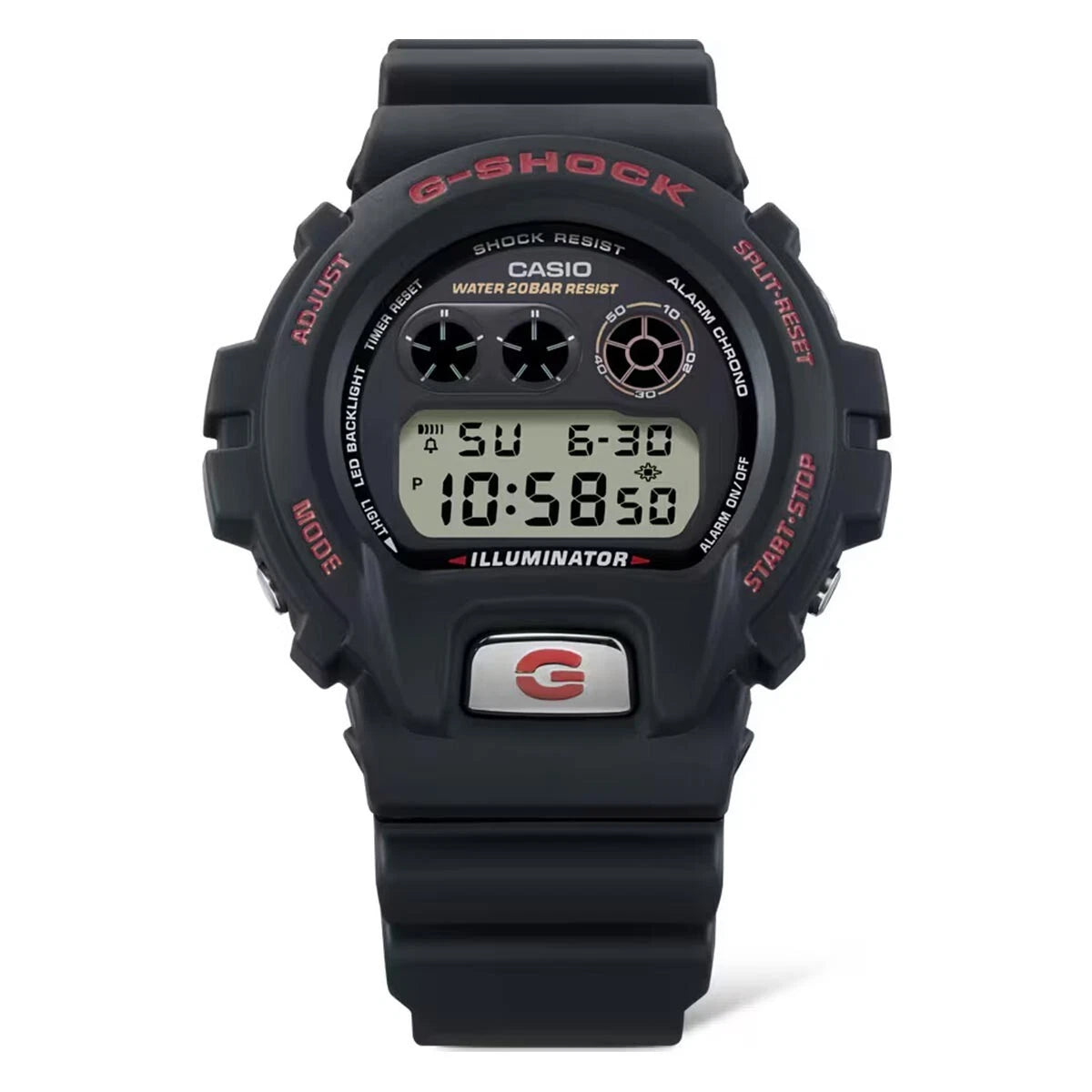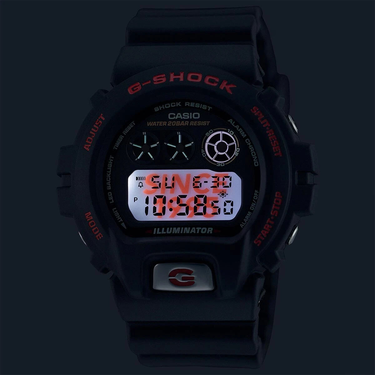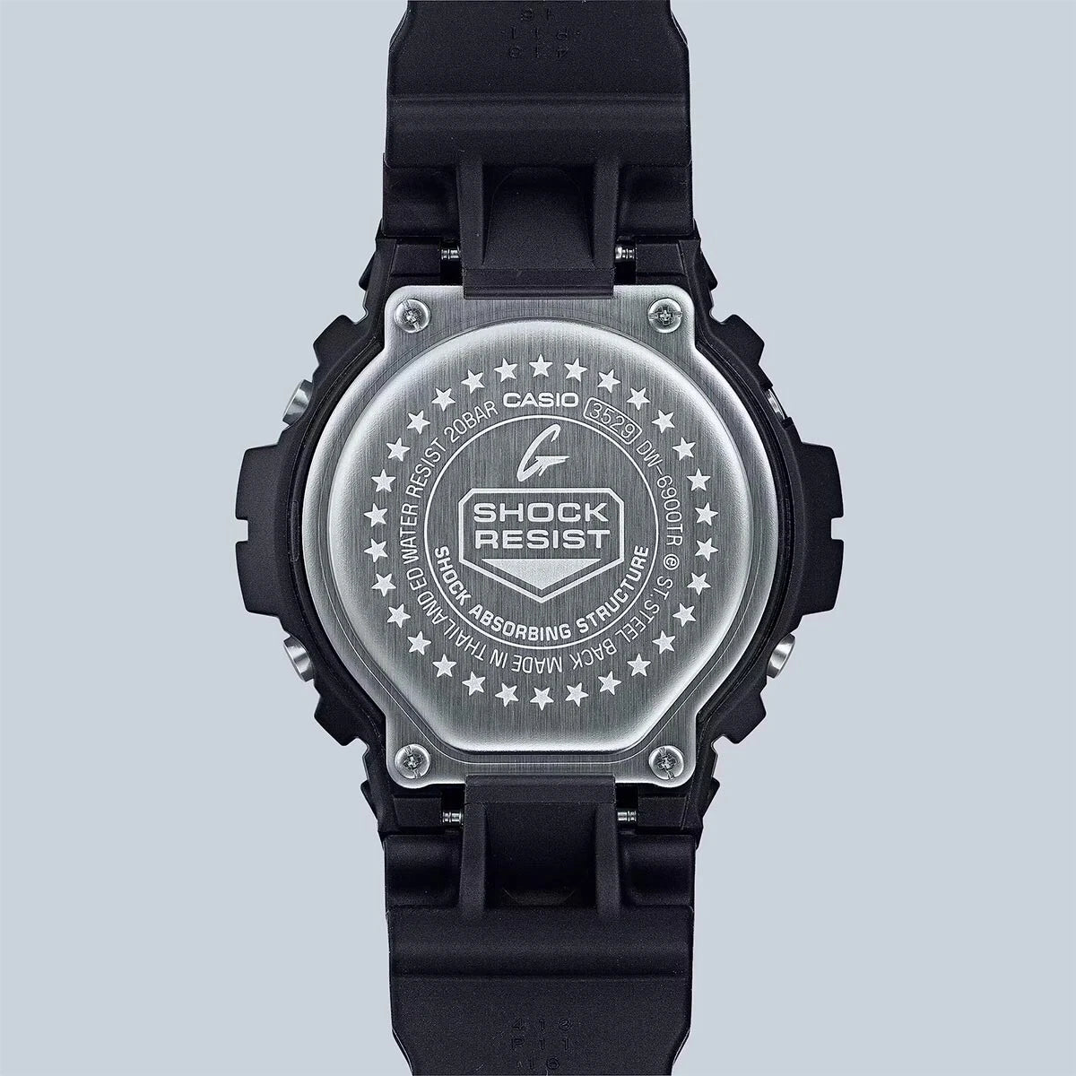 Confident, tough, ready for anything — Make a bold statement with the 30th anniversary lineup of the ever-popular 6900 line, one of the iconic G-SHOCK styles. The DW-6900TR, dressed in the black of the DW-6900H —the first color variation model in the 6900 line — pays homage to the line’s history of diverse evolution all the way back to 1995. We shine the spotlight on the iconic 6900 front button, now in metal with a “G” mark etched into the mirror-finished surface for a powerful sense of presence, right at the heart of the classic round form. Press the light button to activate the backlight and the words “SINCE 1995” appear on the LCD. The “SHOCK RESIST” logo engraved on the case back is surrounded by 30 stars commemorating 30 years of the 6900 line. Key components used in the bezel, band, and more are made with bio-based resin, a material expected to help reduce environmental impact. Special packaging features a “G” symbol motif in a nod to the package design used for the DW-6900H. Each watch comes in a special package design incorporating one of the trio of colors the watches are offered in: red, yellow, or black. All of these details come together for a very special design worthy of the 6900 line anniversary year.