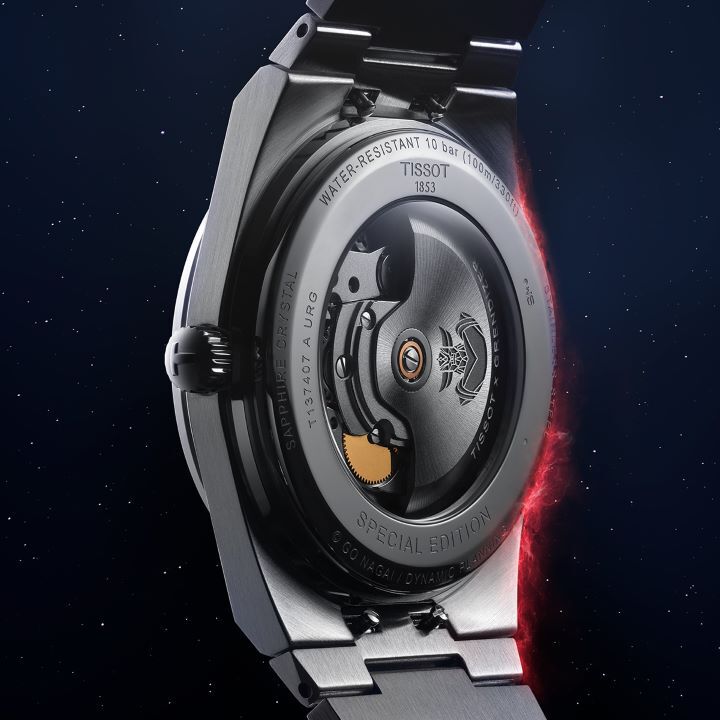 The Tissot PRX Ufo Robot Grendizer merges 70s design with manga anime elements. It features a 40mm case, made of 316L stainless steel and an interchangeable quick-release bracelet. The dial glows with a Super-LumiNova® bust of Grendizer, complemented by a Harken-style second hand and engraved rotor, evoking nostalgia for fans of the serie. Powered by the Powermatic 80 Swiss automatic movement, it offers an 80-hour power reserve. With a see-through case back and scratch-resistant sapphire crystal with antireflective coating, this watch is an all-in-one that blends modern watchmaking with 70s designs and iconic manga culture.