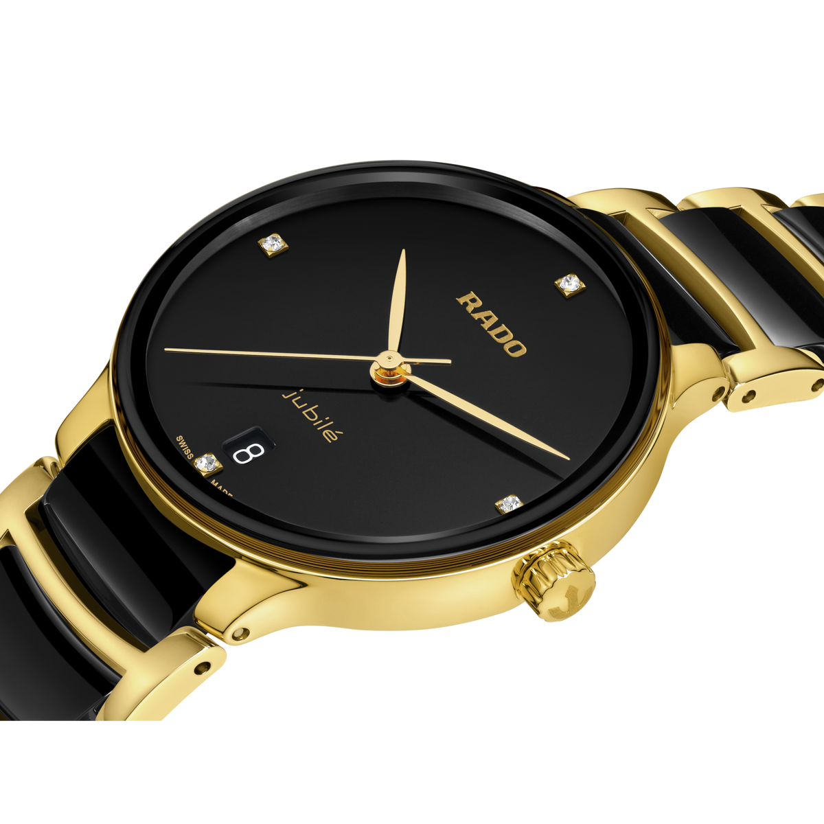The classic Centrix Quartz Diamonds watch has been reworked not only technically, but also aesthetically. The modified model has a rounded sapphire crystal that extends all the way to the edge and a curved case blending with the curved crystal edge. The overall appearance of this iconic timepiece is completed with adjusted case lugs and a bracelet made of polished yellow gold-coloured PVD-coated stainless steel with black high-tech ceramic middle links. The black lacquered dial with 4 diamonds, emphasised with the printed “jubilé” logo, matches perfectly with the yellow gold-coloured hands. Thanks to the PreciDrive and HeavyDrive features in the calibre R073 quartz movement, the watch has greater accuracy and resistance to shocks. The watch is water-resistant down to 50 m.