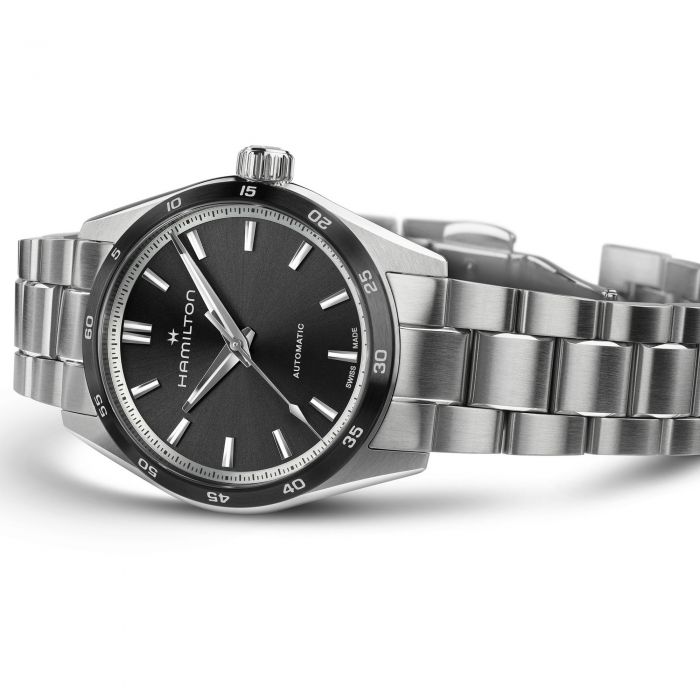Made for those who favor function and style at once, the Jazzmaster Performer line offers a powerful sport-chic appearance. Powered by the H-10 automatic movement with 80 hours power reserve, this Jazzmaster Performer Automatic features a 34mm stainless steel case accented by an understated black dial and a refined stainless steel bracelet.