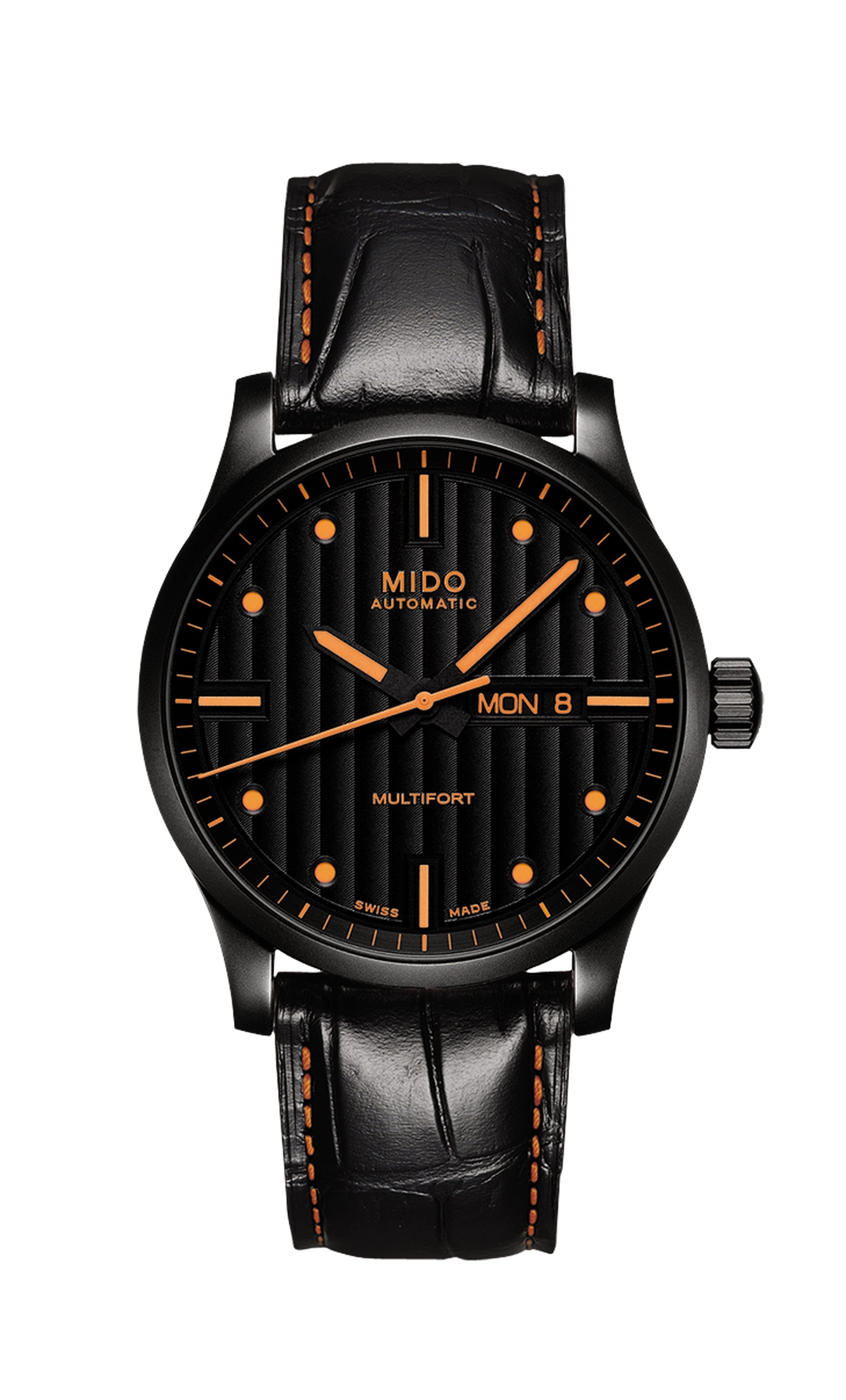 The Special Edition Multifort watch has a very strong look thanks to its black dial and orange appliques and hands. The Caliber 80 automatic movement gives it exceptional autonomy. It is sold with two interchangeable black and orange Mido straps.