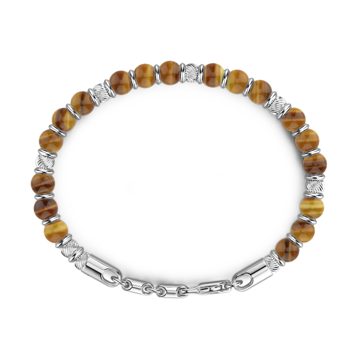 Zancan 925 silver link-only bracelet with knurled spheres and natural hard stone spheres. The bracelet is composed of 5 mm platinum plated silver spheres. The bracelet is covered in hard stone spheres, available in three versions with different stones: onyx, lapis lazuli and tiger's eye. The soft link allows the bracelet to fit perfectly to the wrist. The bracelet's sheen is achieved through a special platinum plating process. A bracelet with a refined, sophisticated design, suited for all situations. The piece is part of the Atomosphere collection, characterized by perfect spheres, symbols of power and energy. The lobster clasp closure makes for a perfect fit. The piece is completely crafted by hand in Italy and weighs 15.80 g.