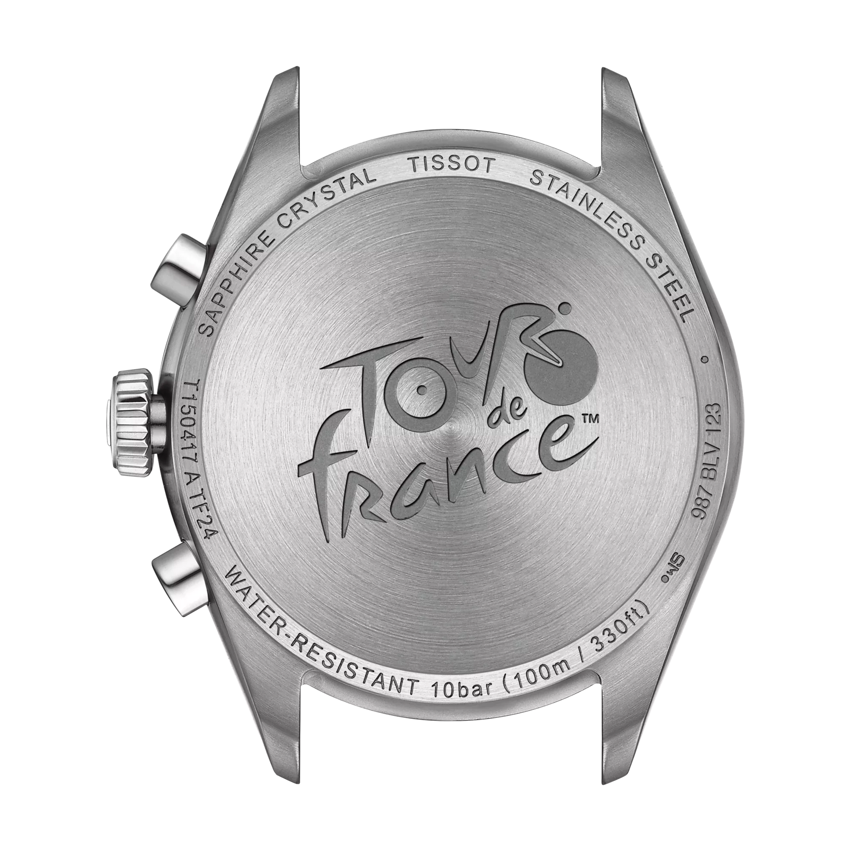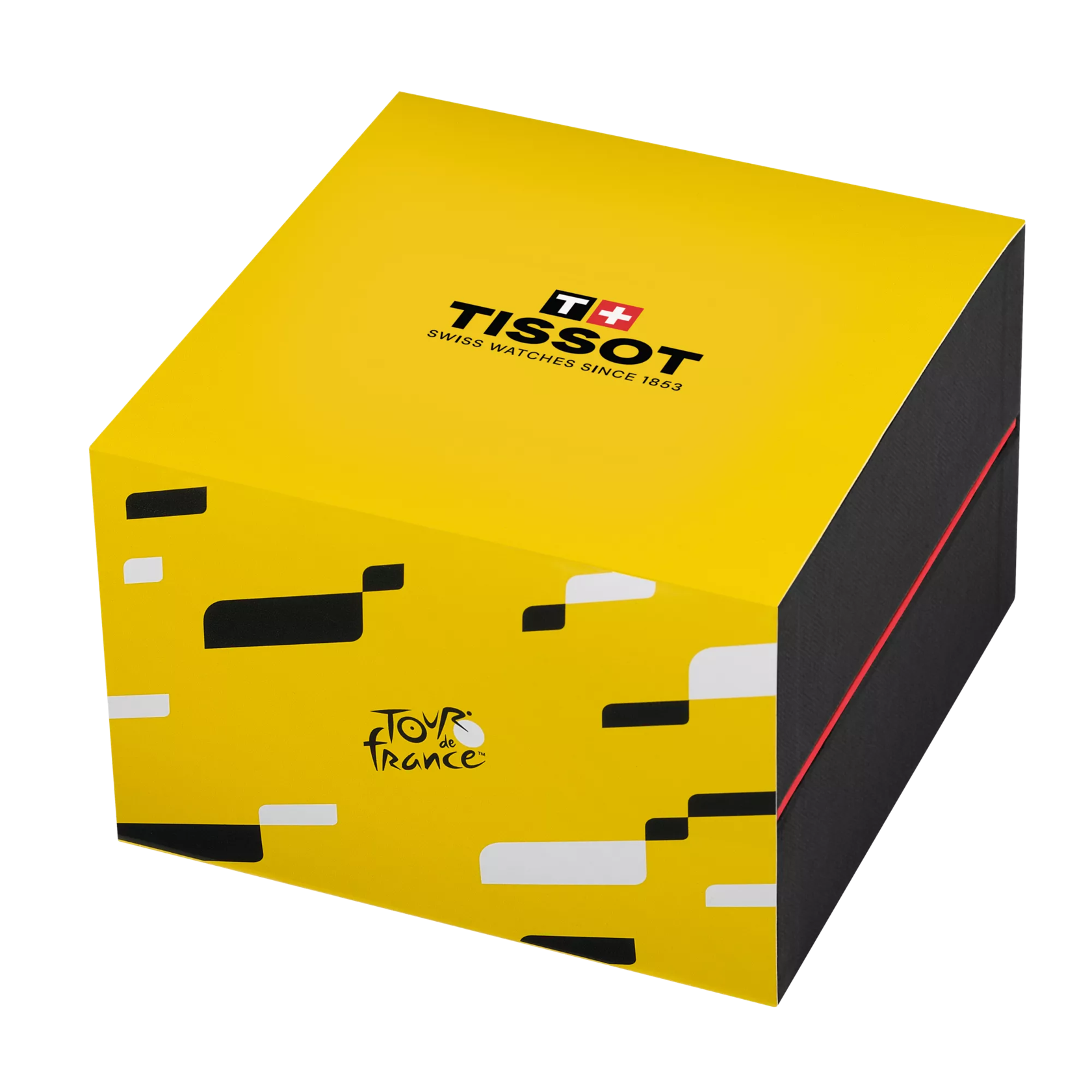 The coloured bicycle shaped second hand pays tribute to the vibrant spirit of the events and elegantly sweeps over an asphalt textured dial. A dedicated caseback engraving reflects your passion for cycling and style. This special edition is delivered with an additional bi-material strap with yellow rubber and black leather.