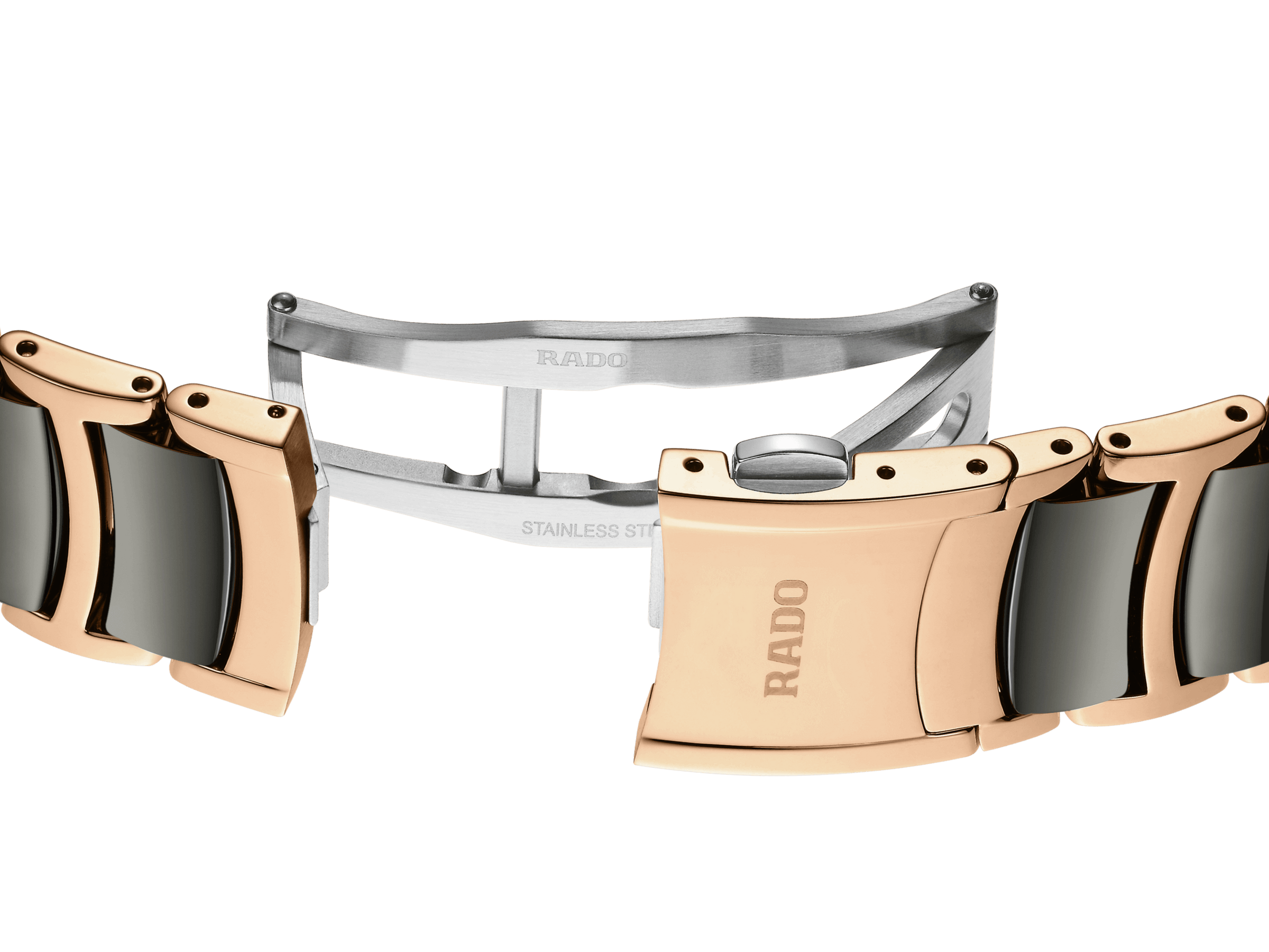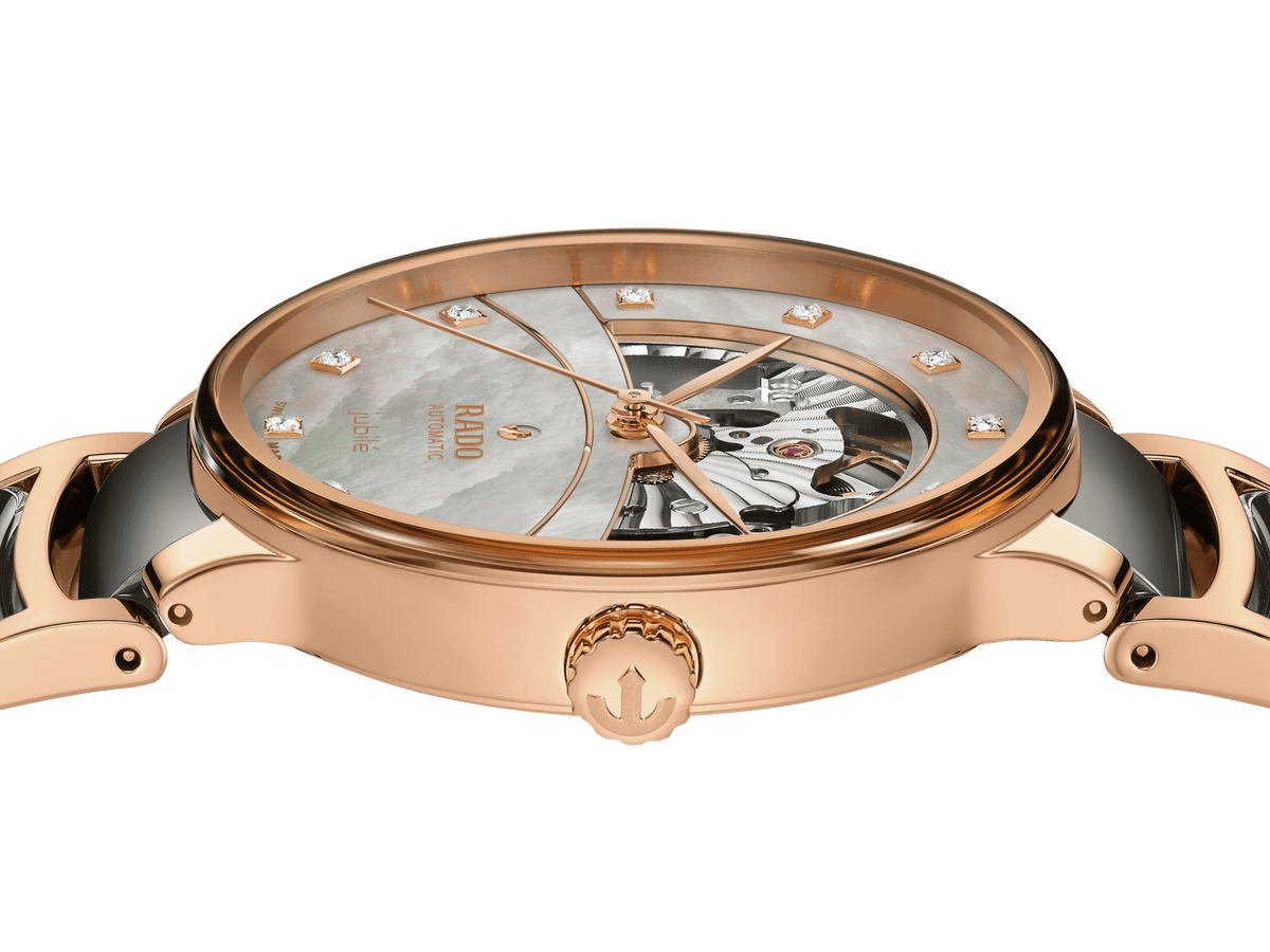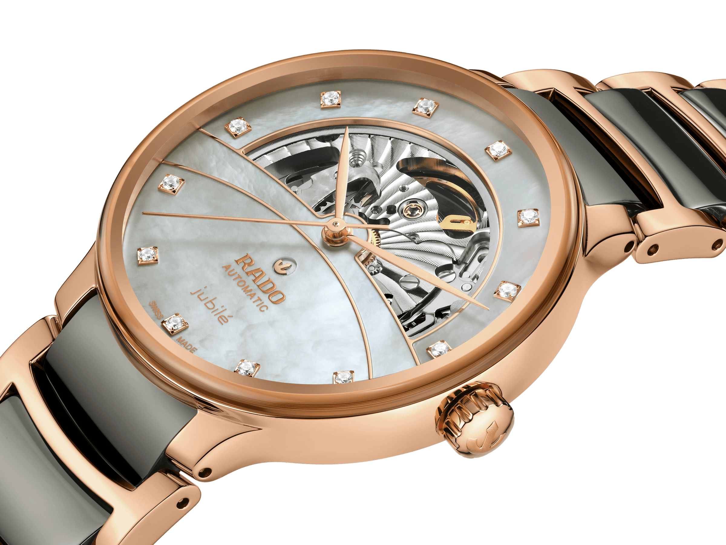 Experience the harmonious blend of artistic expression and design stylings with the Rado Centrix Open Heart watch. As the constellations write their eternal stories above our heads, they build bridges for lovers to meet. A large window, reminiscent at once of dawn and dusk, beautifully frames a state-of-the-art R734 automatic movement with 80 hours of power reserve and an antimagnetic NivachronTM hairspring, as well as a deeply elegant rippled-sunlight "ondulé soleil" motif on chosen component surfaces. The overall appearance of this iconic timepiece is completed with adjusted case lugs and a bracelet made of polished rose-gold-coloured PVD-coated stainless steel with plasma high-tech ceramic middle links. The light silver mother-of-pearl dial with 12 diamonds, emphasised with the rose gold coloured printed “jubilé” logo, matches perfectly with the hands. The watch is water resistant down to 50 m and is also available in M size.