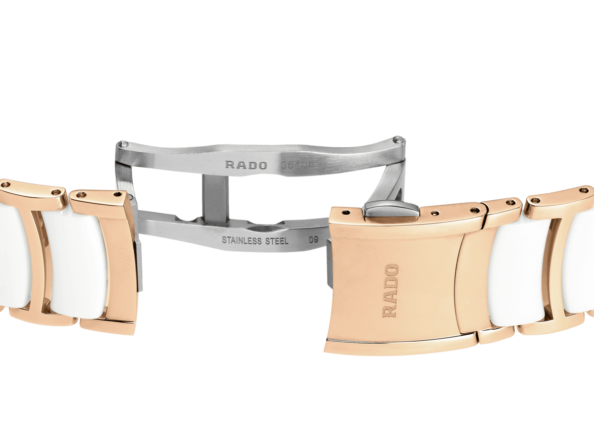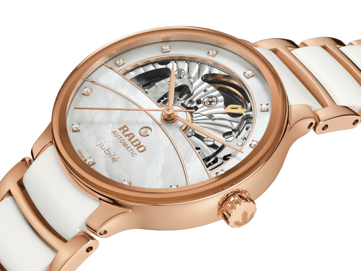 Experience the harmonious blend of artistic expression and design stylings with the Rado Centrix Open Heart watch. As the constellations write their eternal stories above our heads, they build bridges for lovers to meet. A large window, reminiscent at once of dawn and dusk, beautifully frames a state-of-the-art R734 automatic movement with 80 hours of power reserve and an antimagnetic NivachronTM hairspring, as well as a deeply elegant rippled-sunlight "ondulé soleil" motif on chosen component surfaces. The overall appearance of this iconic timepiece is completed with adjusted case lugs and a bracelet made of polished rose-gold-coloured PVD-coated stainless steel with white high-tech ceramic middle links. The white mother-of-pearl dial with 12 diamonds, emphasised with the rose gold coloured printed “jubilé” logo, matches perfectly with the hands. The watch is water resistant down to 50 m.