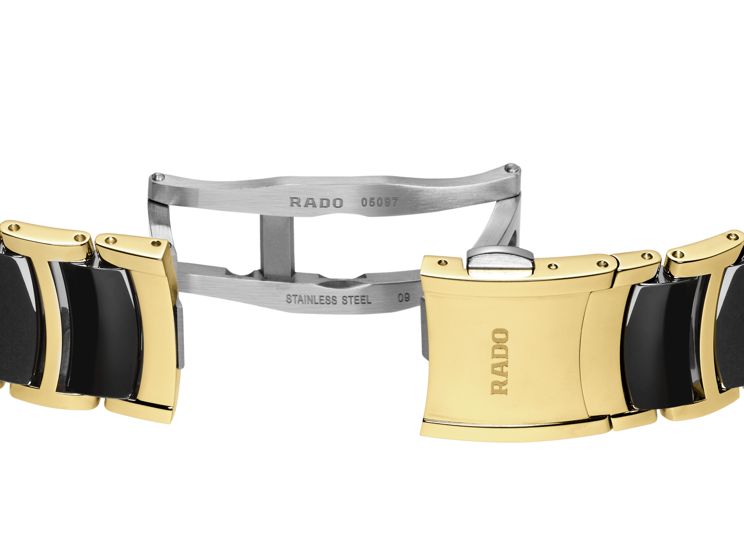 The overall appearance of this iconic timepiece is completed with adjusted case lugs and a bracelet made of yellow gold coloured PVD coated stainless steel with black high-tech ceramic middle links. The black facetted dial with 12 diamonds has an opulent 3D effect created by stamping a shaped dial and then filling it with lacquer. The watch is water resistant down to 50 m and offers 80 hours of power reserve.