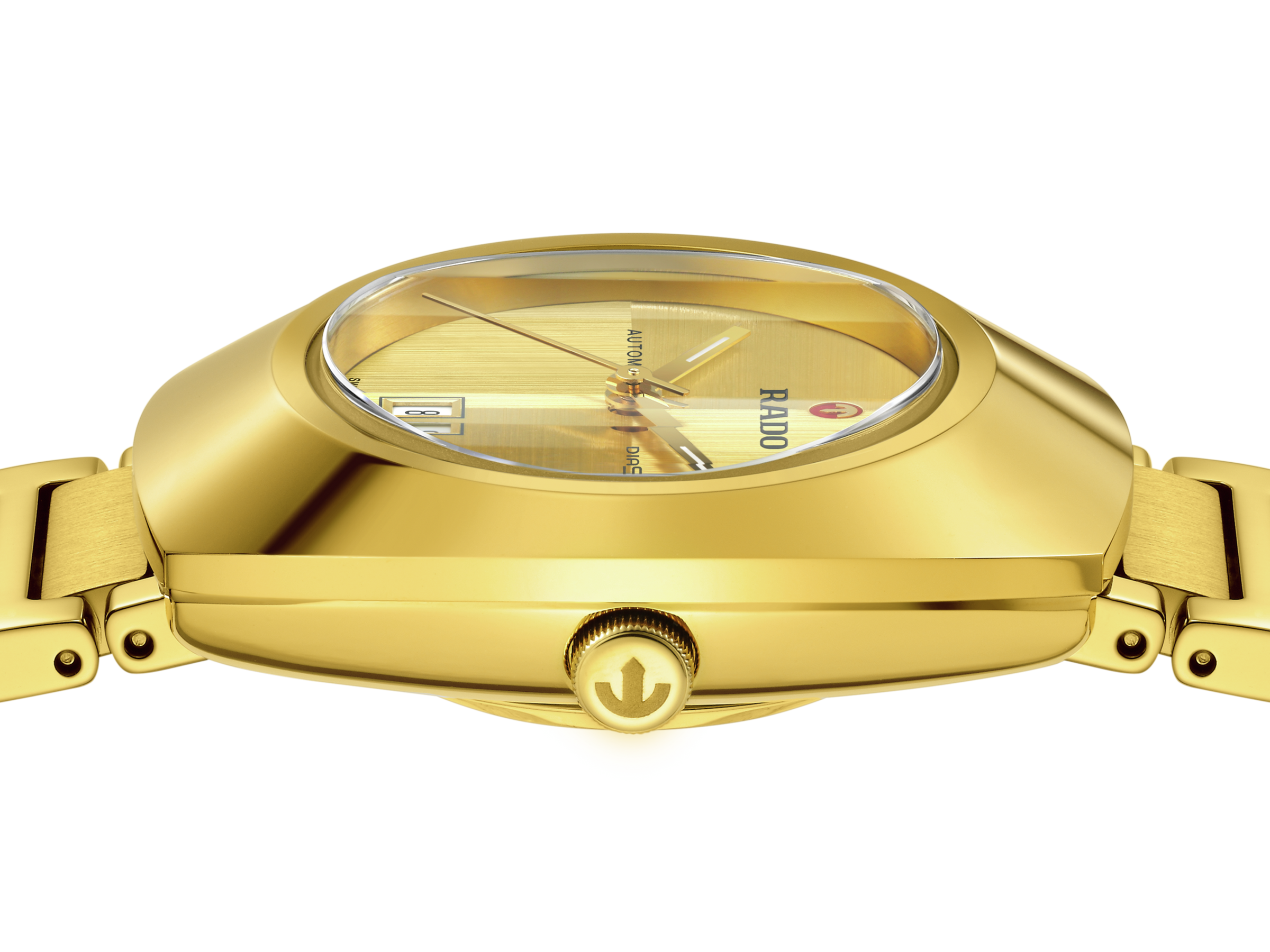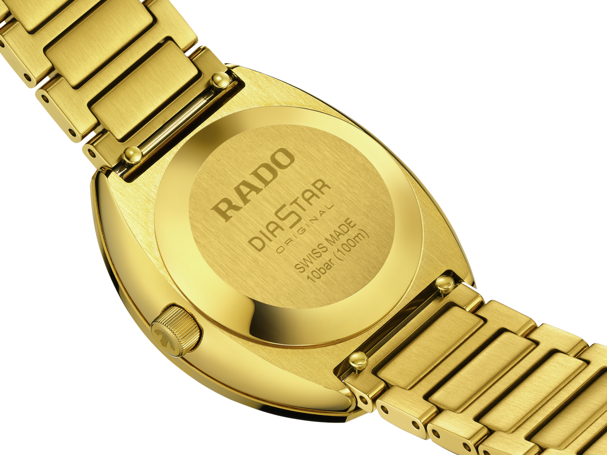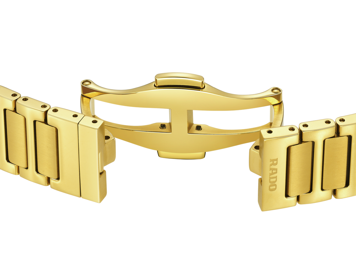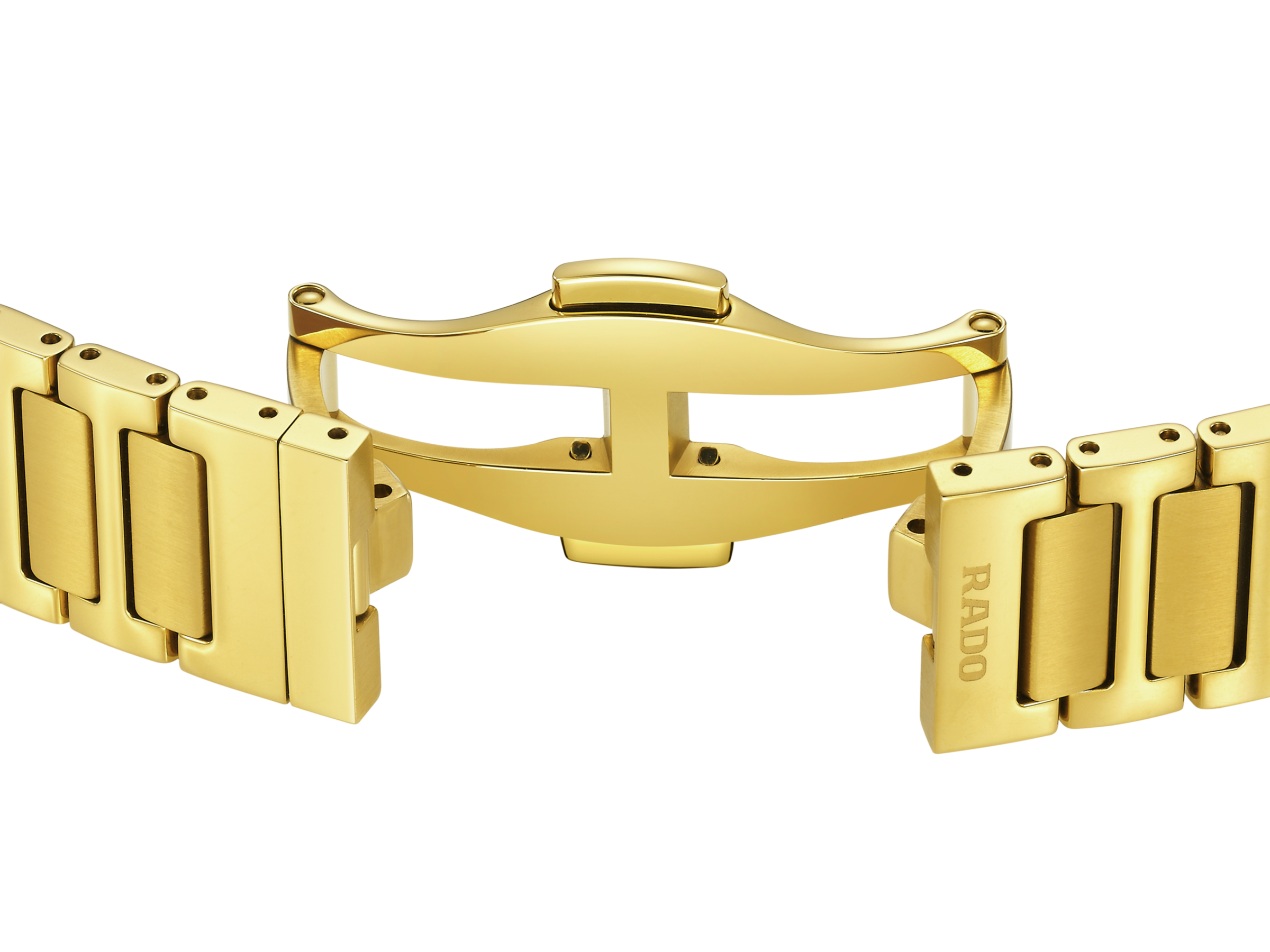 An iconic symbol of Swiss craftsmanship and pioneering innovation. The Rado Diastar is designed for those who dare to embrace the extraordinary. The 30 mm case, crowned by a polished yellow gold-coloured Ceramos™ bezel, merges effortlessly with a polished yellow-gold coloured PVD coated stainless-steel middle case, offering water resistance up to 10 bar (100 metres).