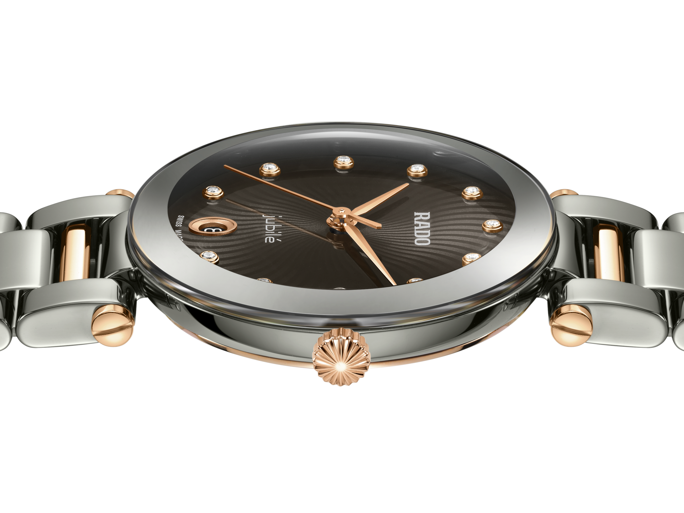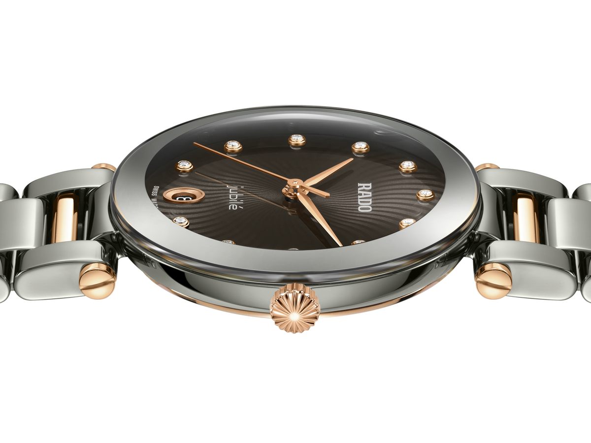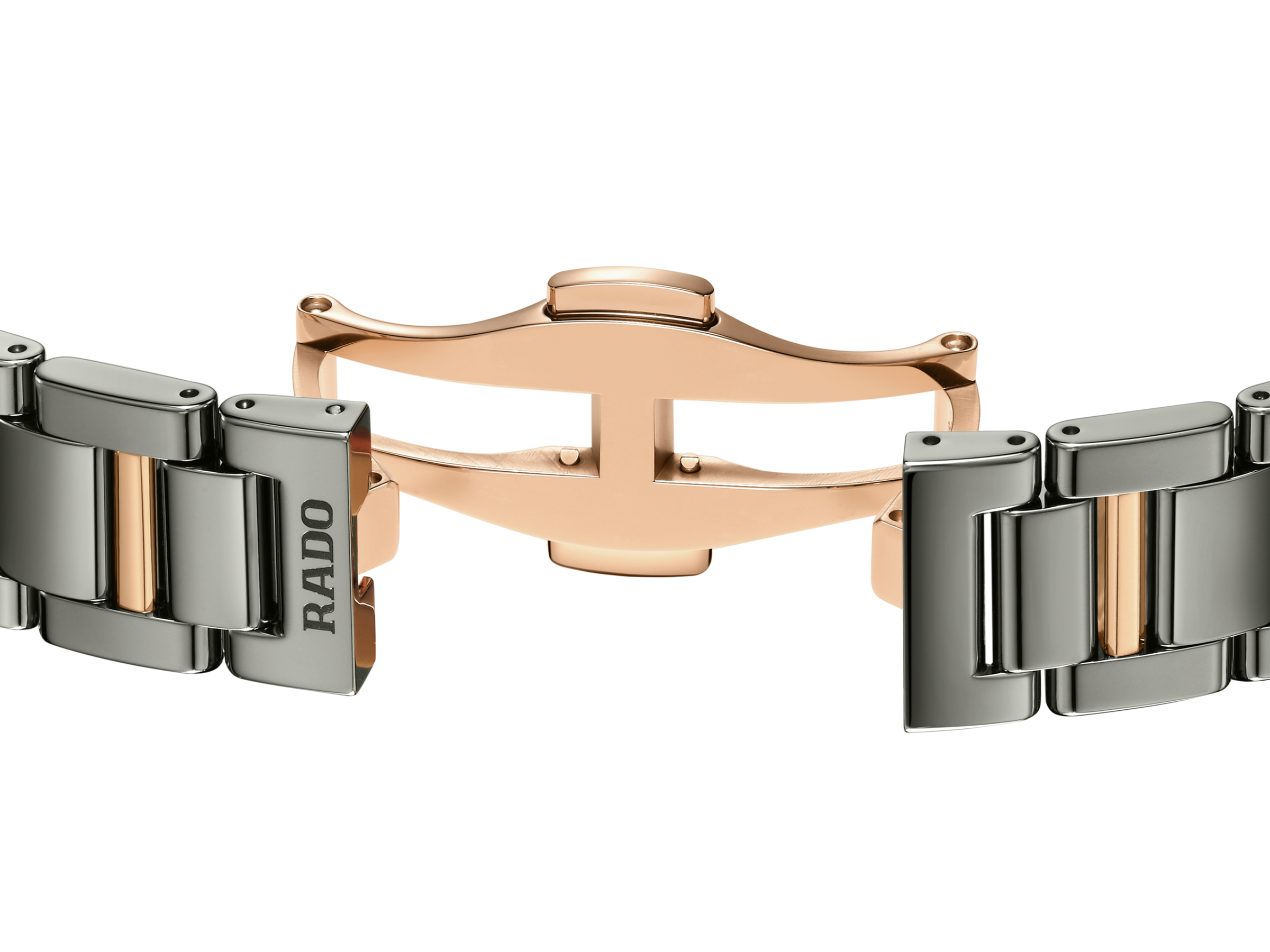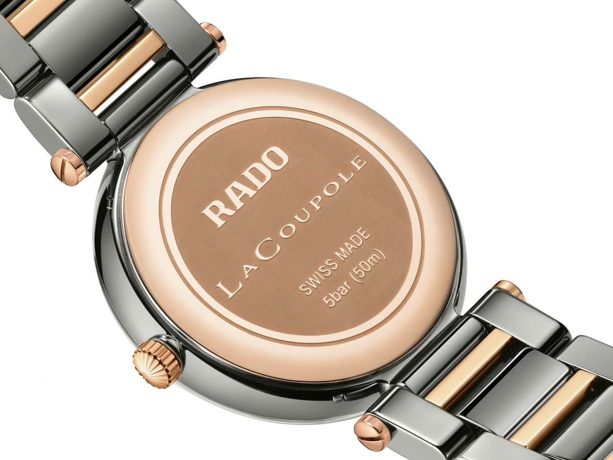 LaCoupole stands as a tribute to the icons of yesterday, redefined for today’s sophisticated wearer. An expression of refined glamour, engineered with the precision and innovation only Rado can offer. Its 31 mm monobloc case in polished plasma high-tech ceramic is crowned by a domed sapphire crystal, elevated by a grey & rose gold coloured metallised border. The case is water-resistant to 5 bar (50 metres), uniting everyday resilience with enduring elegance.
