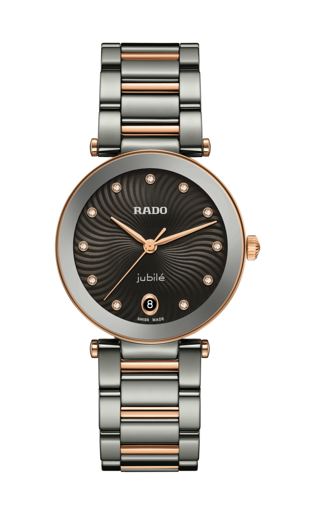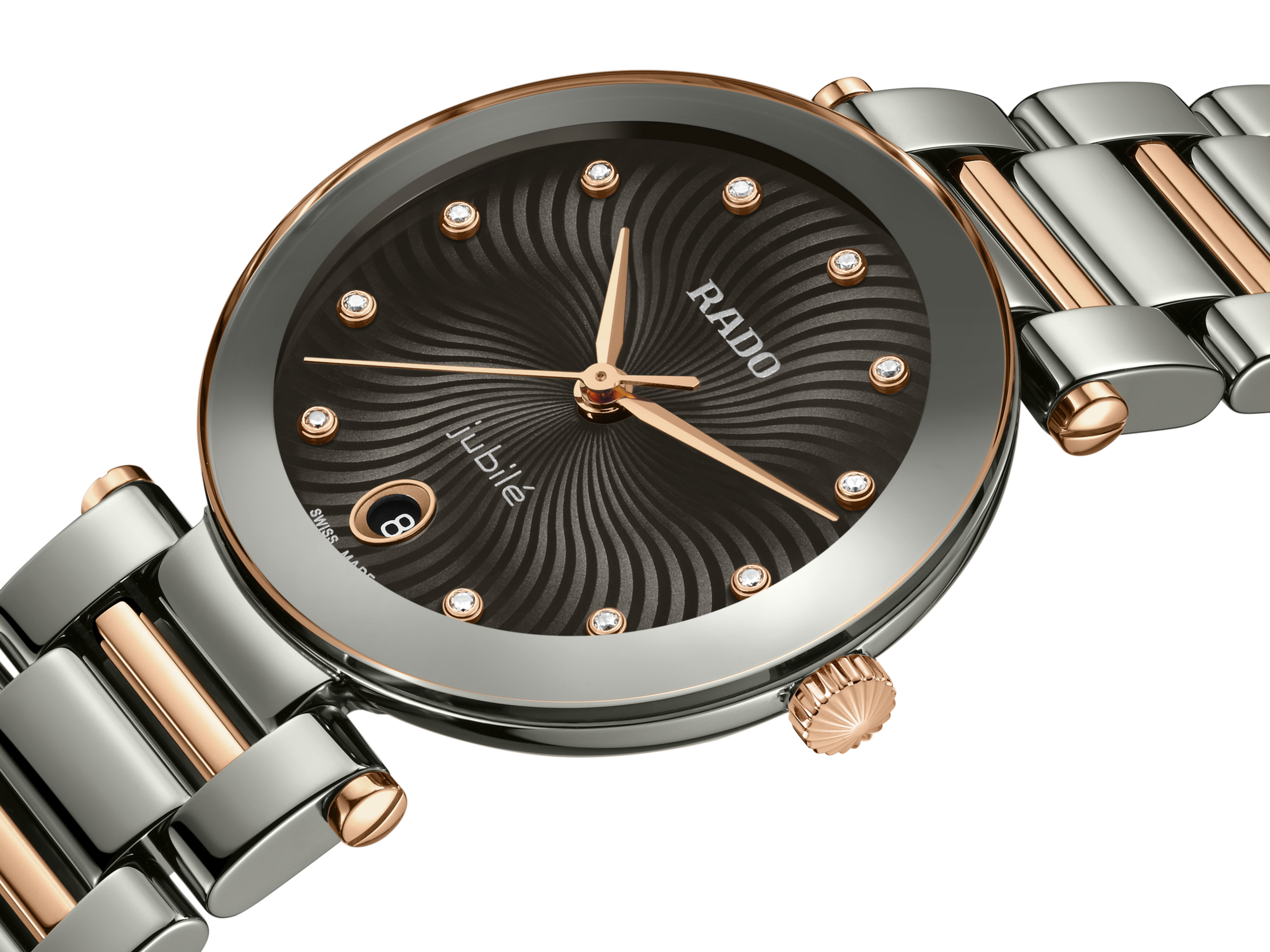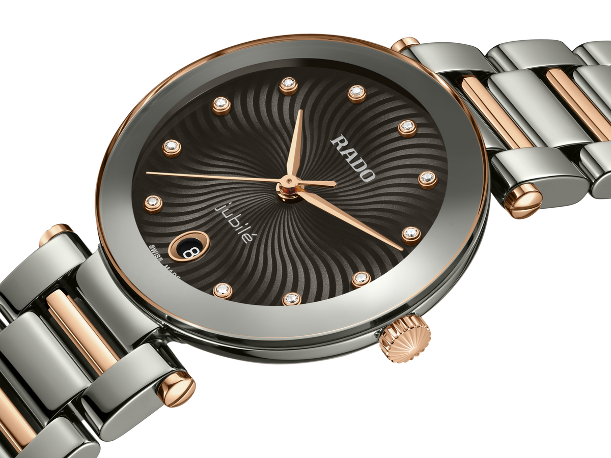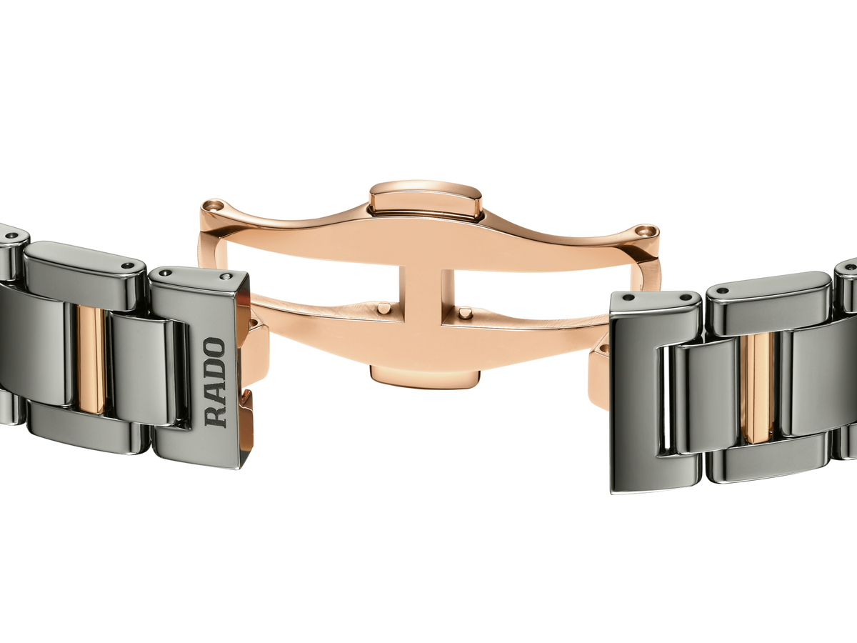 LaCoupole stands as a tribute to the icons of yesterday, redefined for today’s sophisticated wearer. An expression of refined glamour, engineered with the precision and innovation only Rado can offer. Its 31 mm monobloc case in polished plasma high-tech ceramic is crowned by a domed sapphire crystal, elevated by a grey & rose gold coloured metallised border. The case is water-resistant to 5 bar (50 metres), uniting everyday resilience with enduring elegance.