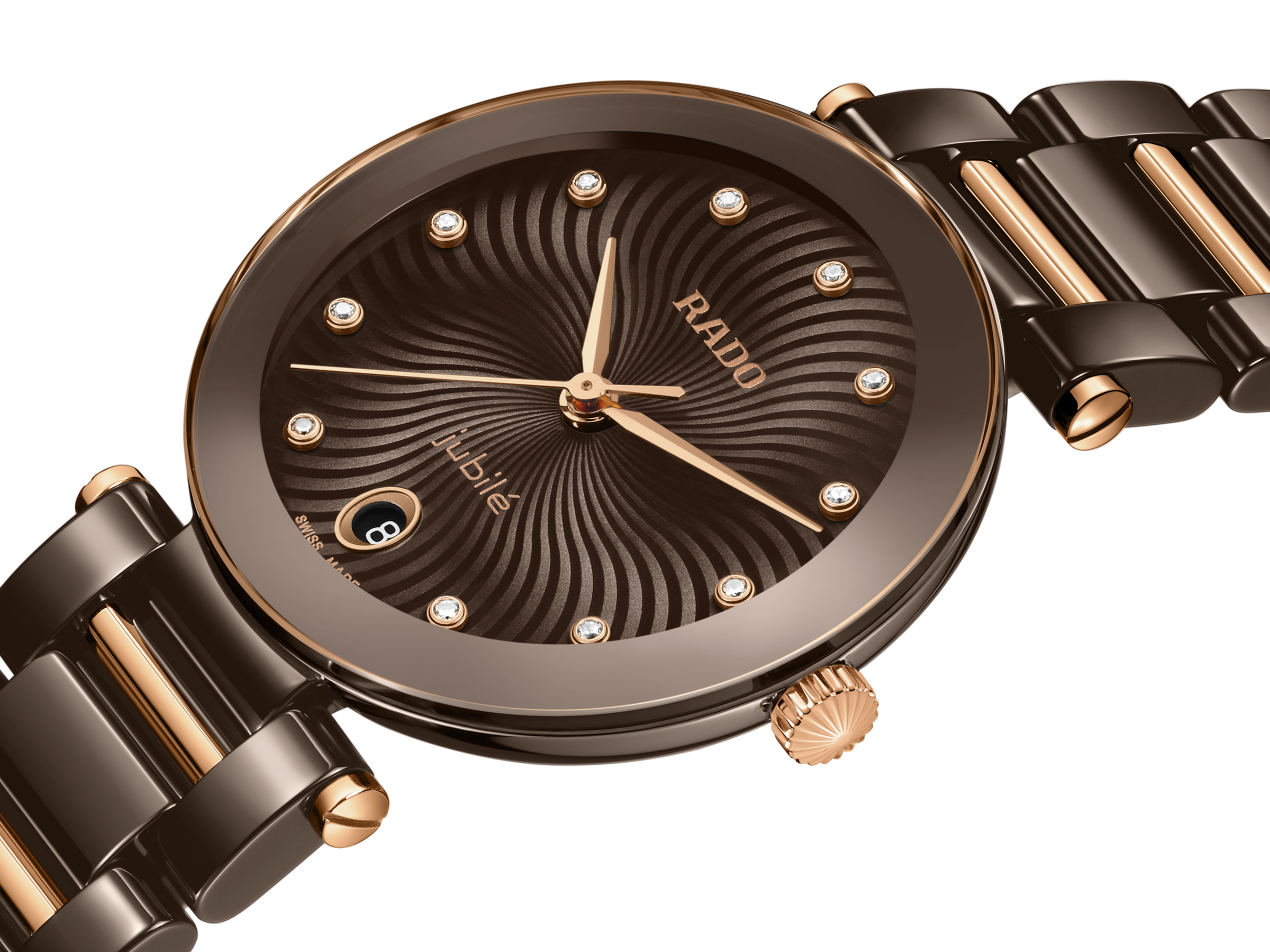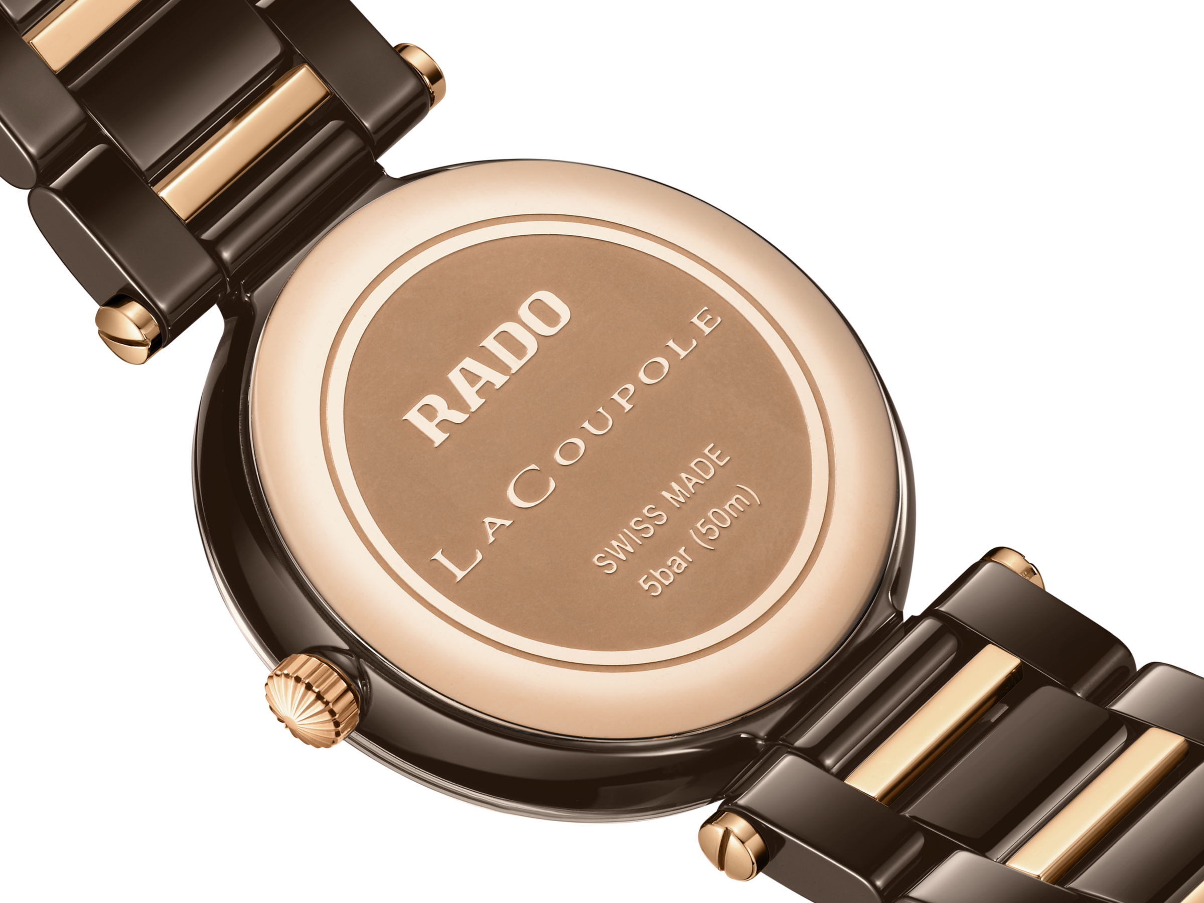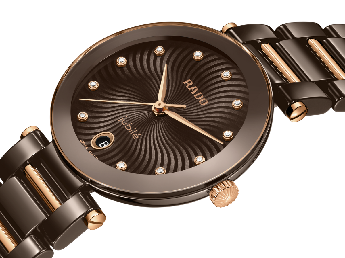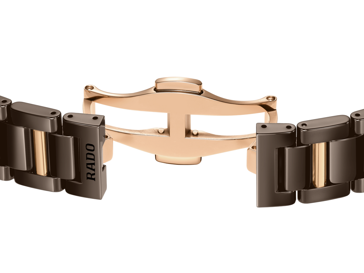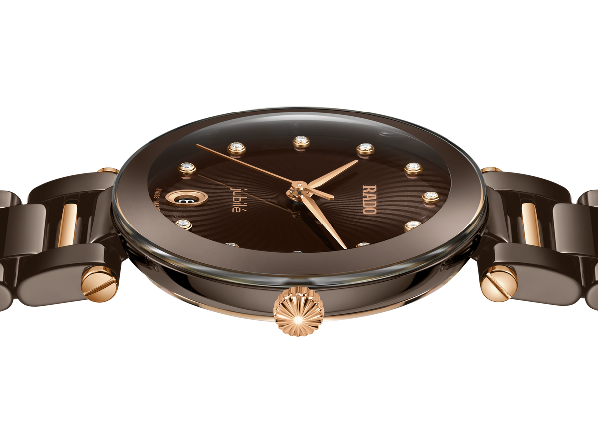 LaCoupole stands as a tribute to the icons of yesterday, redefined for today’s sophisticated wearer. An expression of refined glamour, engineered with the precision and innovation only Rado can offer. Its 31 mm monobloc case in polished brown high-tech ceramic is crowned by a domed sapphire crystal, elevated by a brown & rose gold coloured metallised border. The case is water-resistant to 5 bar (50 metres), uniting everyday resilience with enduring elegance. The result is a silhouette that is unmistakably Rado—sleek, sculptural, and timeless.