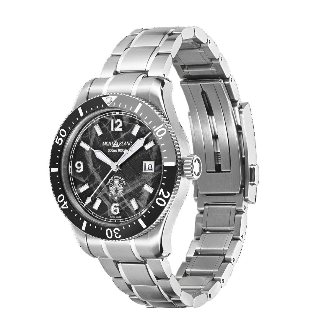 The first-ever sports diving watch for Montblanc, the Montblanc Iced Sea Automatic Date features a glacier pattern dial that gives the impression of looking into the depths of a glacier. This black glacial pattern dial is inspired by the Mer de Glace - Sea of Ice - the main glacier of the Mont-Blanc Massif. Its texture was achieved using an almost-forgotten ancestral technique called gratté-boisé. The timepiece is housed in a 41mm stainless steel case and comes with a unidirectional bi-colour ceramic bezel, an engraved case back, and a tapered interchangeable stainless steel bracelet with fine adjustment for precision fitting. The timepiece conforms to the ISO 6425 norm for diving watches and is water-resistant to 300 metres.