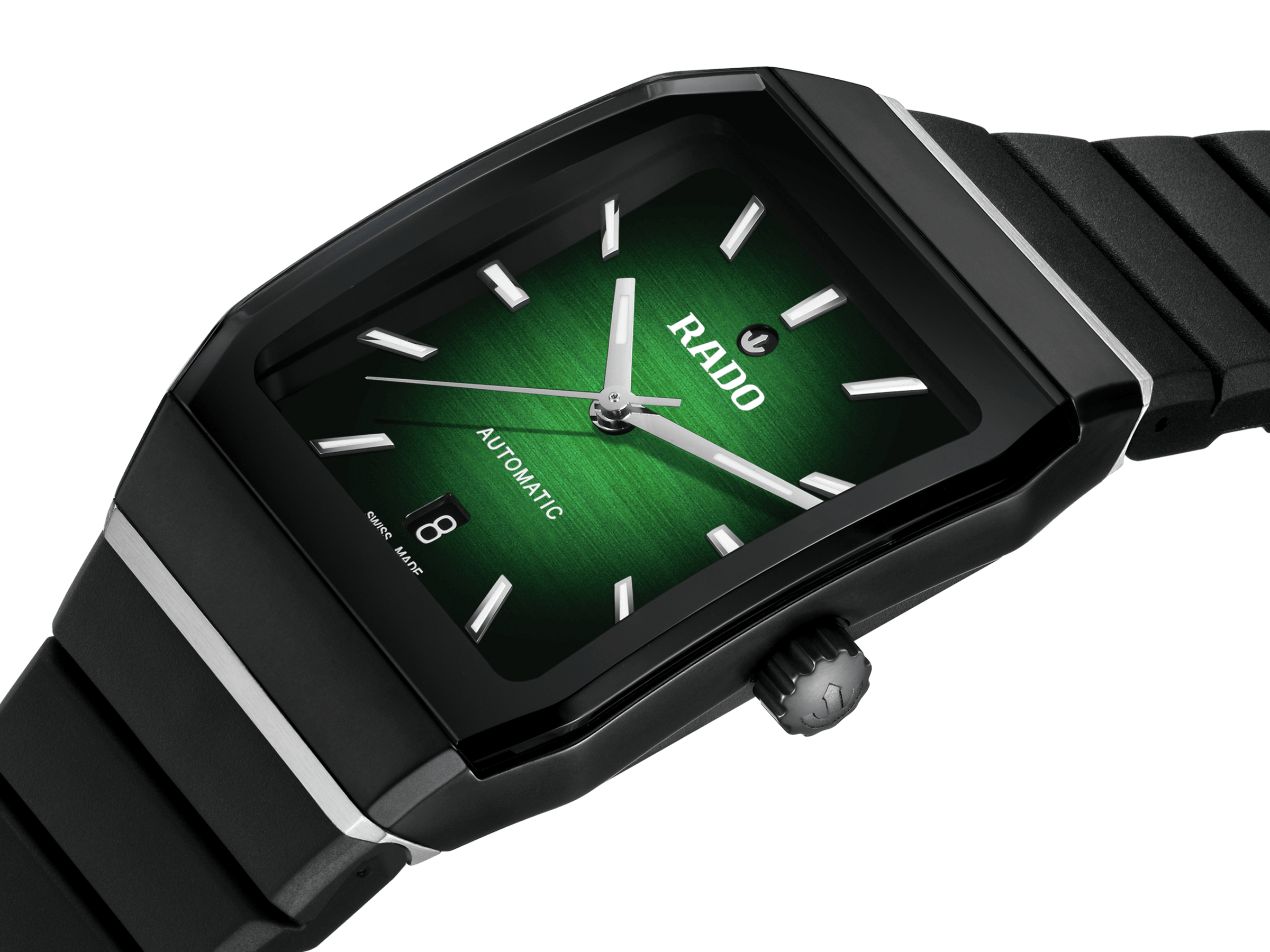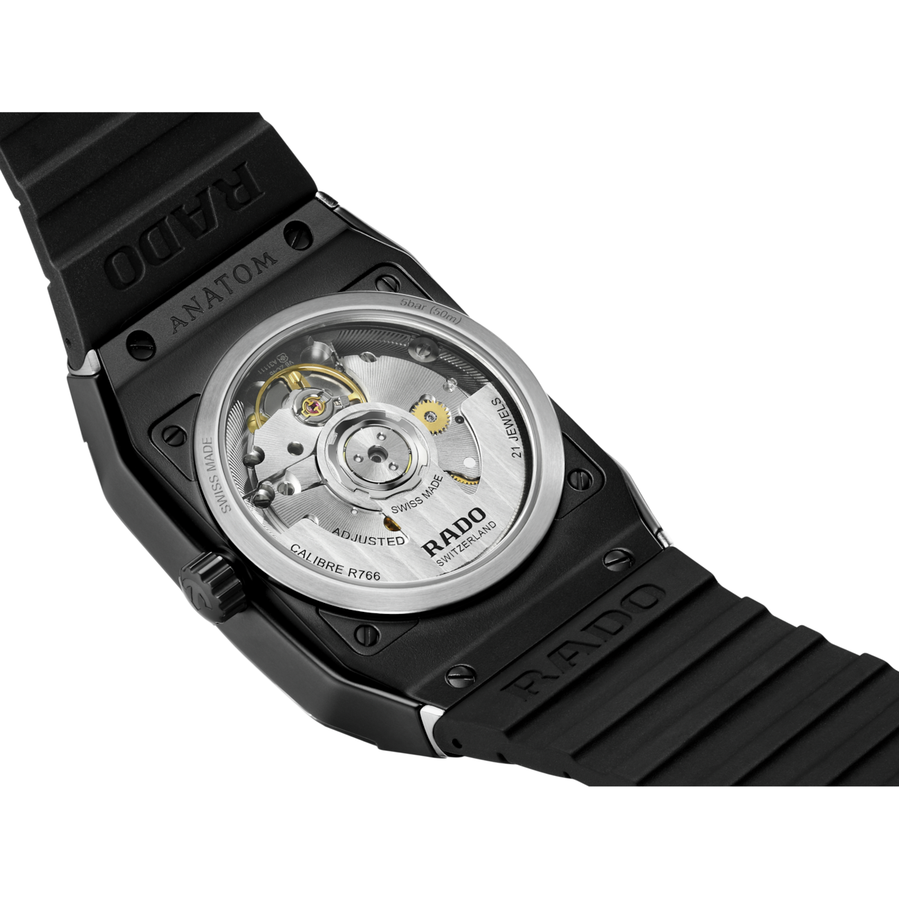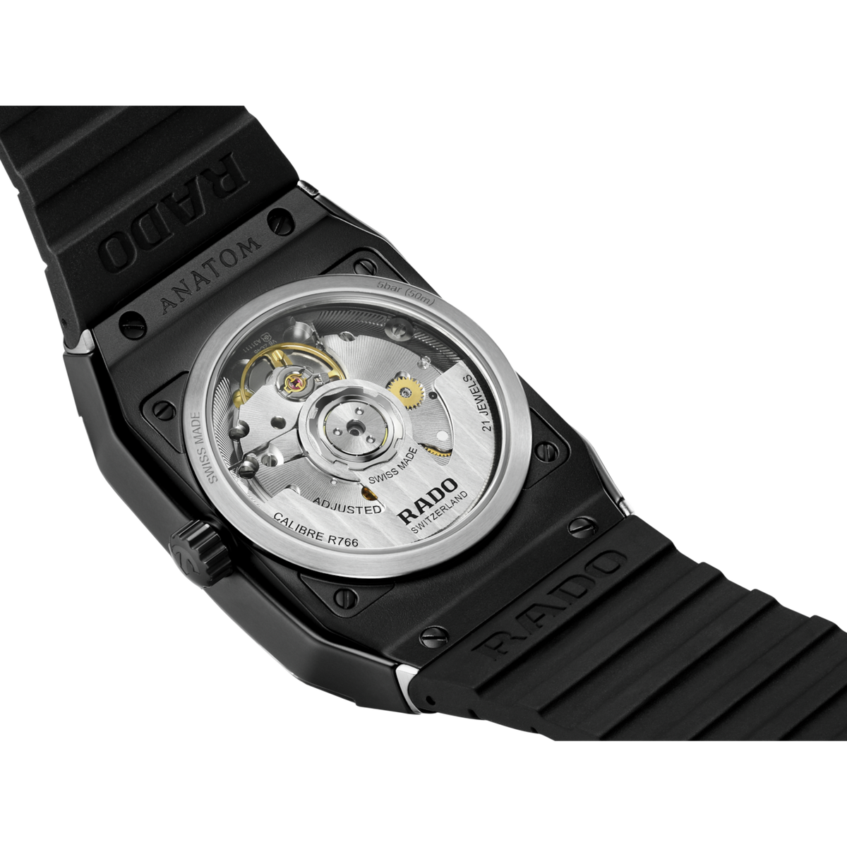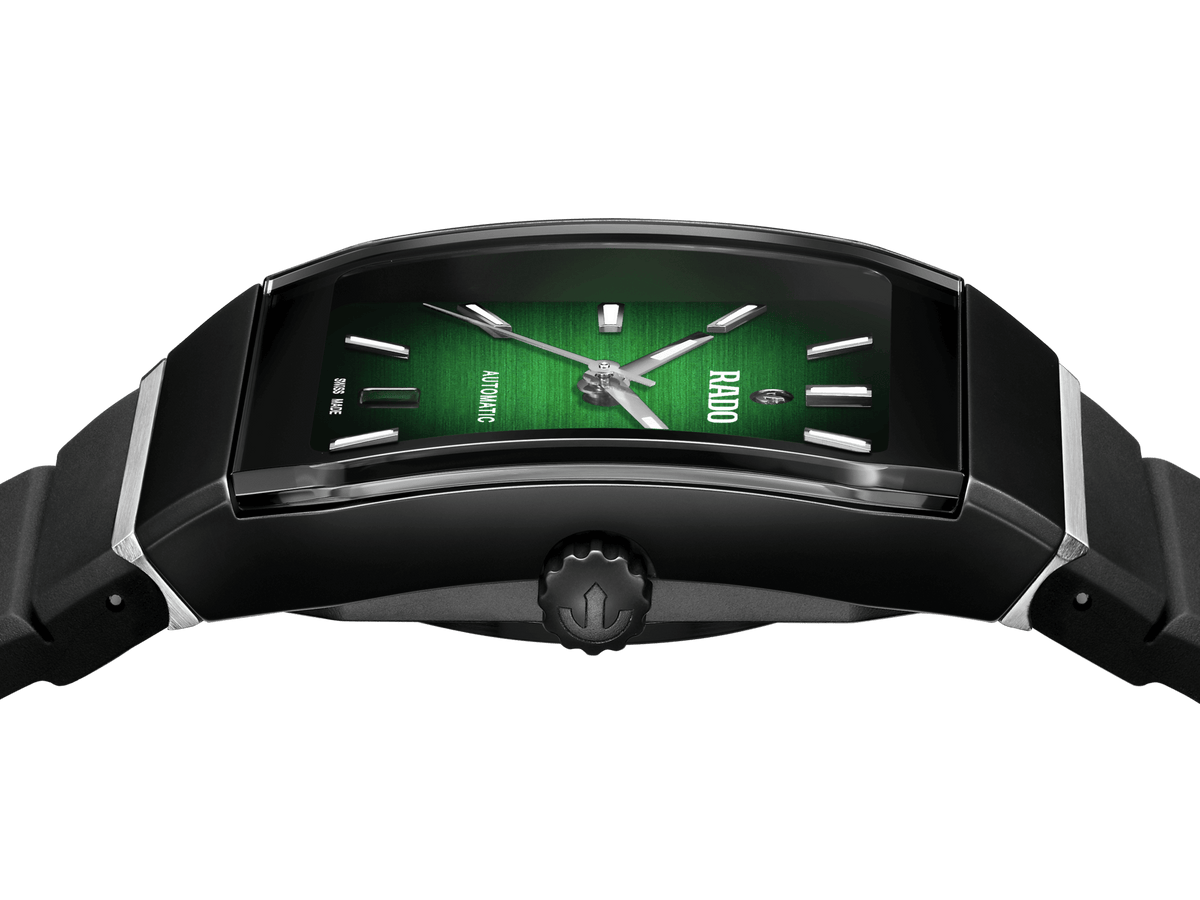 Discover the perfect harmony of comfort and aesthetics with the Rado Anatom Automatic. Powered by the Rado calibre R766 movement and equipped with a Nivachron™ antimagnetic hairspring, this watch ensures precise timekeeping with effortless elegance. Crafted for durability and sophistication, the watch boasts a black matt high-tech ceramic bezel and a cylindrical sapphire crystal with anti-reflective on the inside. The transparent stainless steel caseback offers a glimpse into the mesmerising inner workings of the watch. The dial exhibits a captivating green to black gradient, adding depth and allure to the watch's design. Designed for all-day comfort, the black rubber strap is secured by a brushed stainless steel 3-fold clasp and a black matt high-tech ceramic cover. The watch is water-resistant down to 50 m.