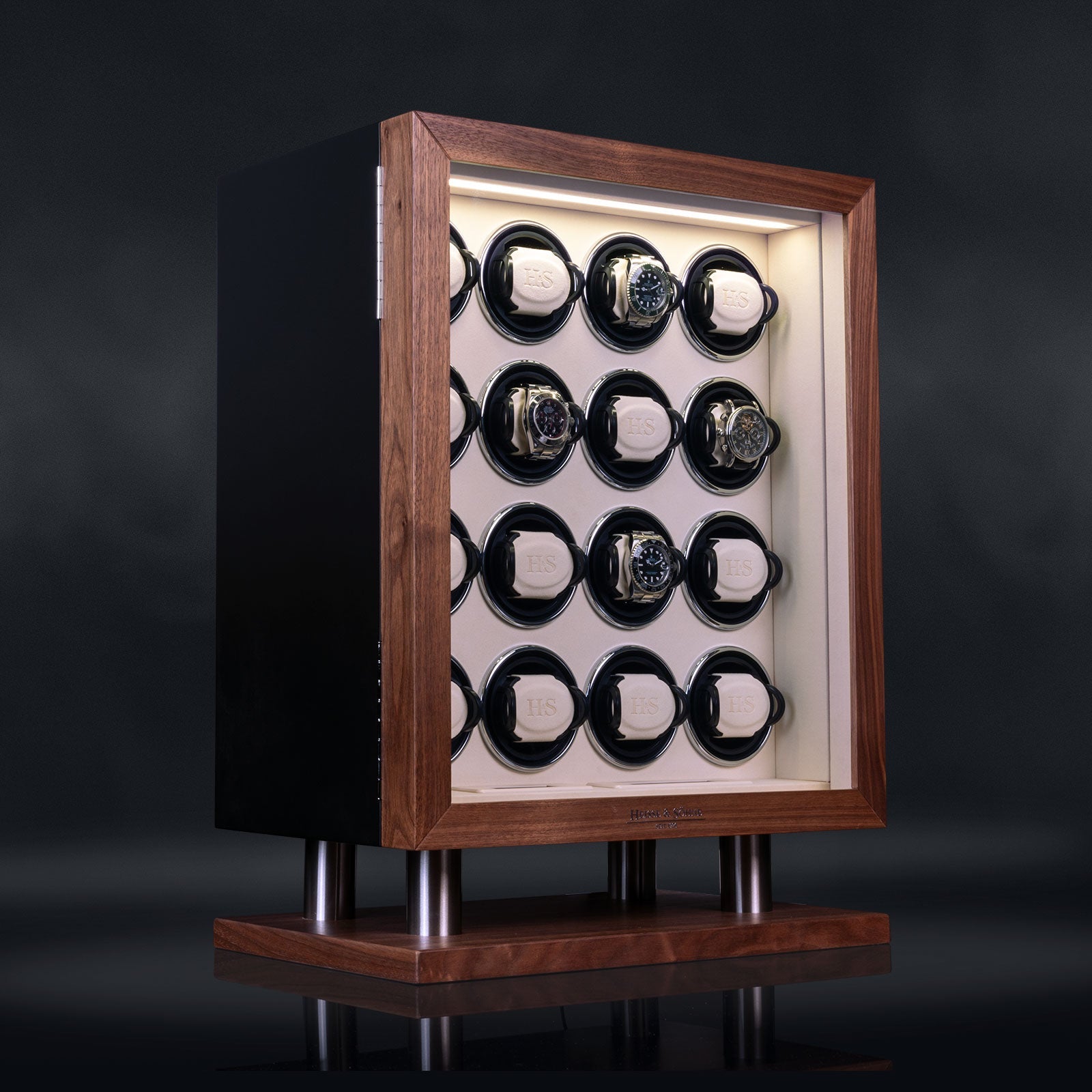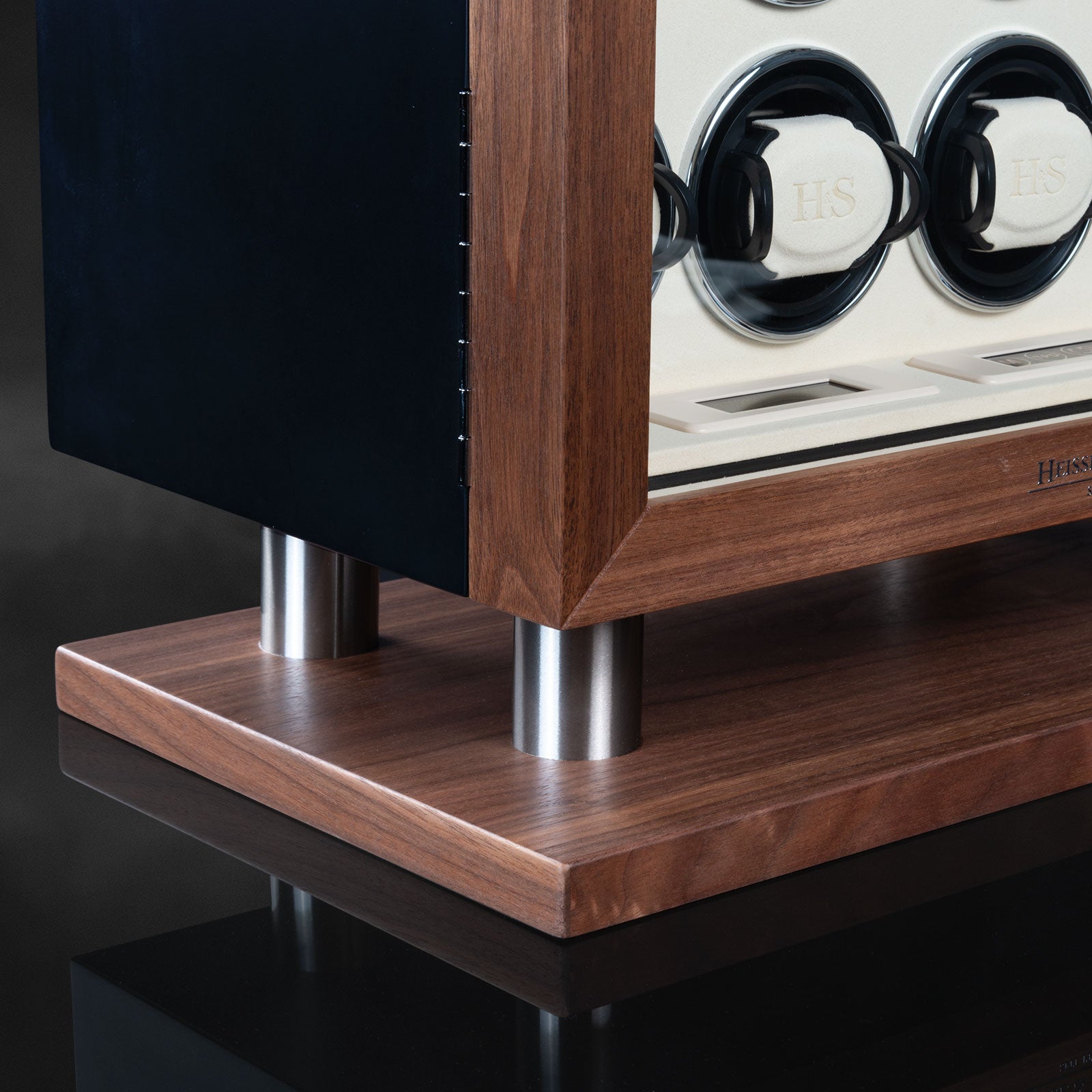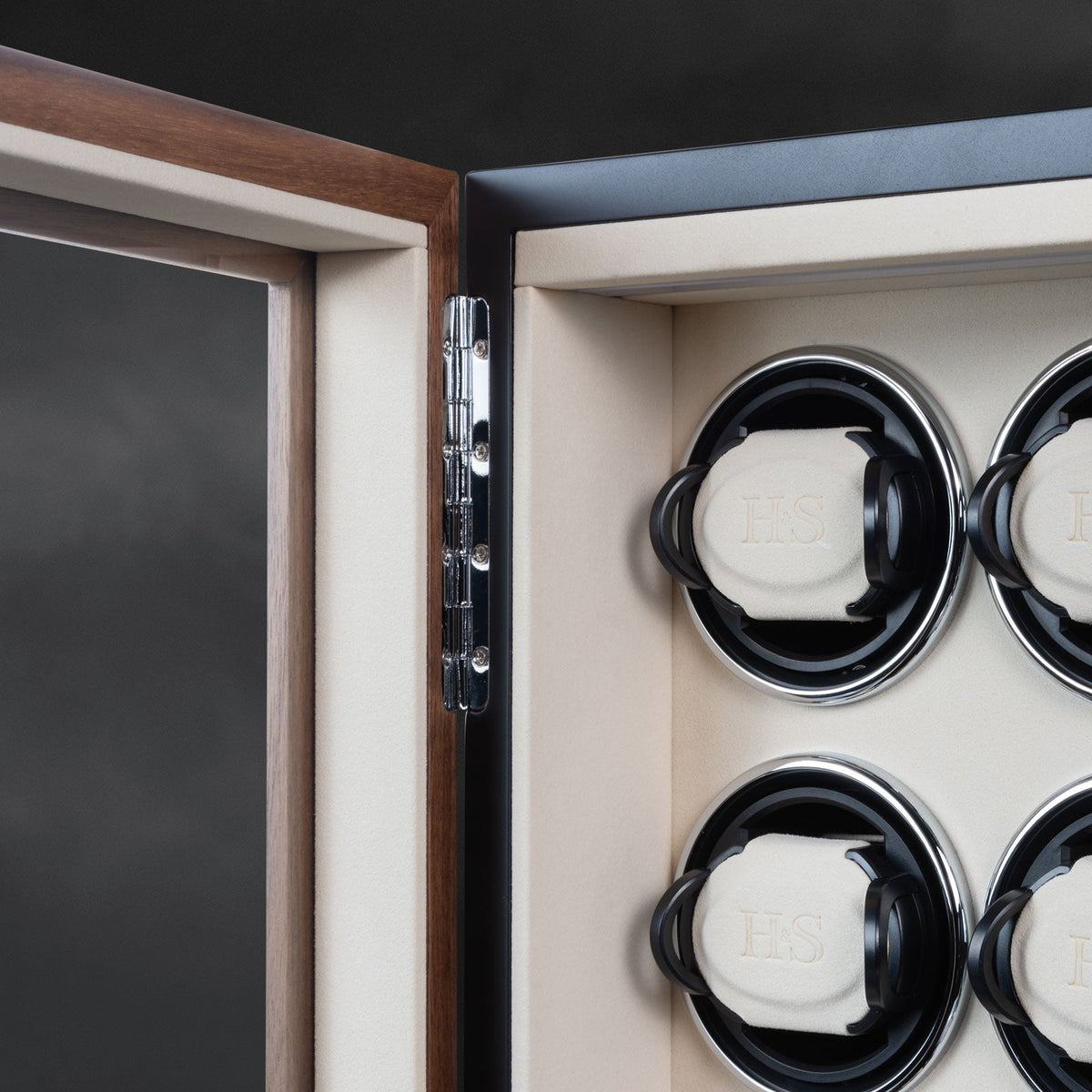 The ever-growing fascination with mechanical timepieces is leading to rapidly growing watch collections. The watch winders of the New York series are predestined for safe and stylish storage. The combination of American walnut and matte lacquer gives this series its simple elegance. The brushed and anodized aluminum applications in the base are highly expressive features of this series. The separately switchable interior lighting sets your watches perfectly in scene at any time of day or night. A lock protects the watches in the watch winder from unauthorized access.