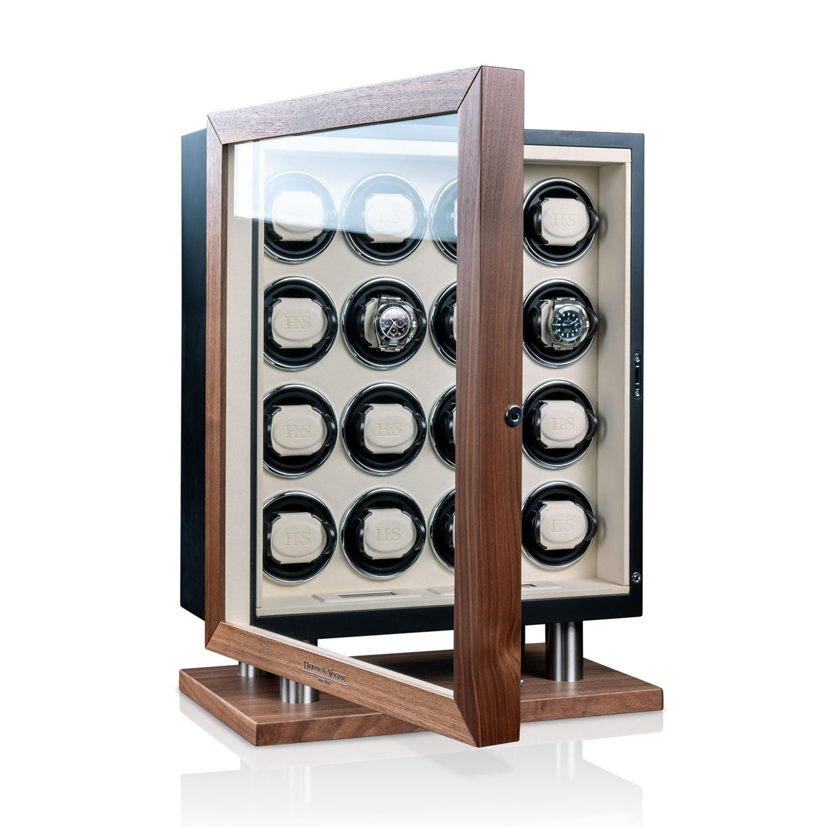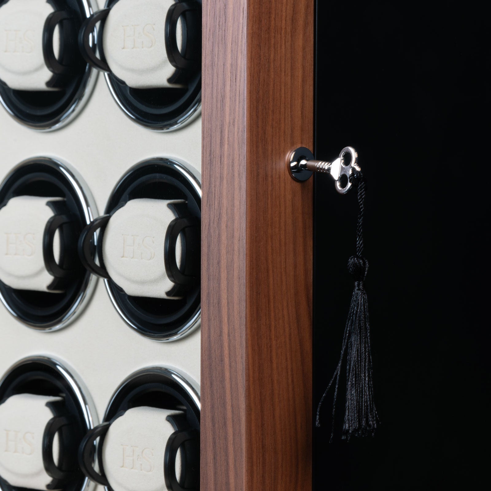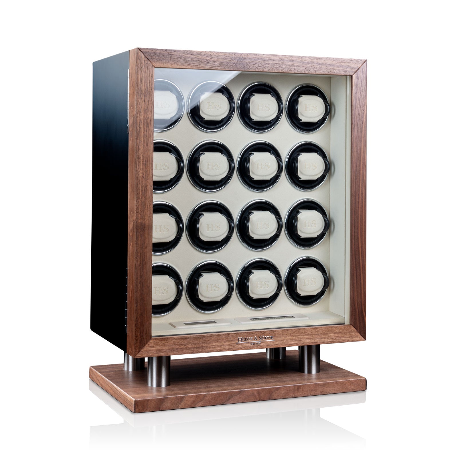 The ever-growing fascination with mechanical timepieces is leading to rapidly growing watch collections. The watch winders of the New York series are predestined for safe and stylish storage. The combination of American walnut and matte lacquer gives this series its simple elegance. The brushed and anodized aluminum applications in the base are highly expressive features of this series. The separately switchable interior lighting sets your watches perfectly in scene at any time of day or night. A lock protects the watches in the watch winder from unauthorized access.