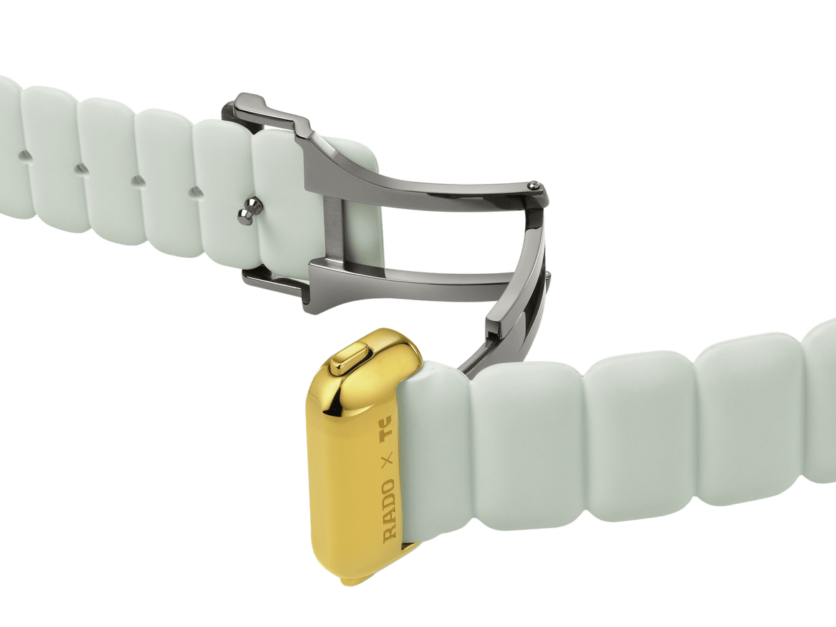 Powering this time machine is the automatic R764 calibre. Finely regulated in five positions and equipped with a Nivachron™ hairspring, this movement delivers a high level of accuracy and 80-hour power reserve. Completing the ensemble, a radical grey, pillow-shaped rubber strap is secured by a dark grey PVD-coated stainless steel extendable folding clasp, topped with a yellow gold-coloured cover and pushers engraved with Rado x TC inscriptions.