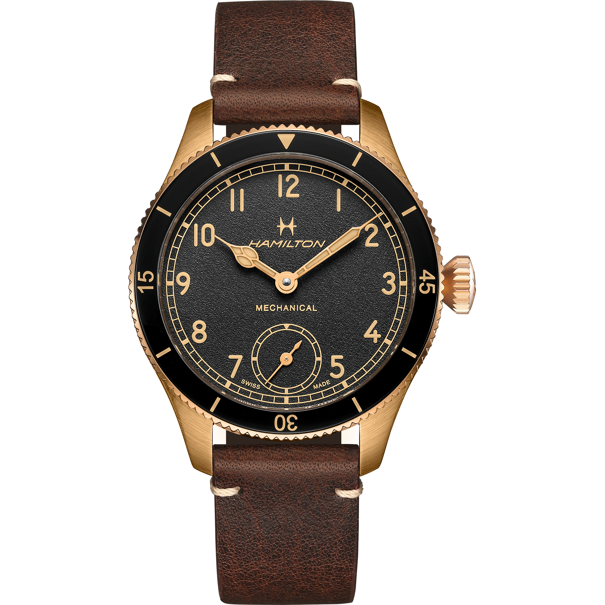 Inspired by the Model 23, a cutting-edge pocket watch used by U.S. soldiers during WWII, the Khaki Pilot Pioneer's distinctive design is a tribute to Hamilton's aviation and military heritage. The sporty yet refined pilot watch retains an indisputably technical feel with its handwinding mechanical movement, bi-directional rotating bezel and prominent winding crown. Available with a sleek stainless steel or unique bronze case, this 43mm timepiece is ready to fly.