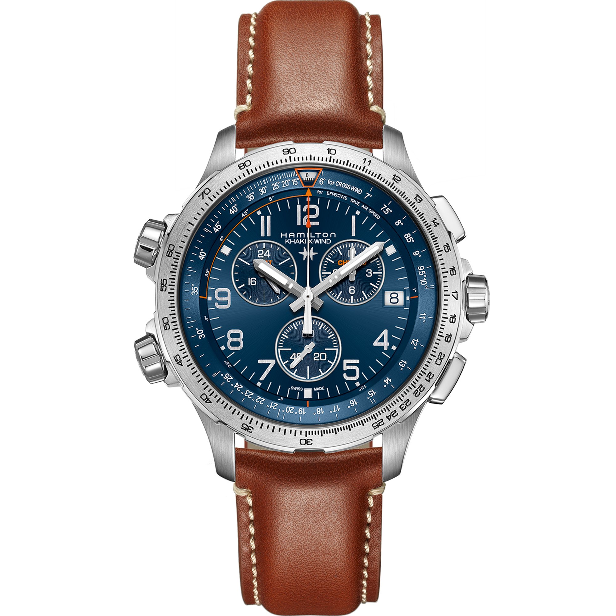 Crosswind calculator, chronograph and now a second time zone: It takes a super sized 46mm stainless steel case to contain all the aviation features the Hamilton designers have packed into this latest addition to the Khaki X-Wind collection. Adventure meets accuracy and makes a lasting impression, whether you're the captain of the craft or on board as a passenger.
