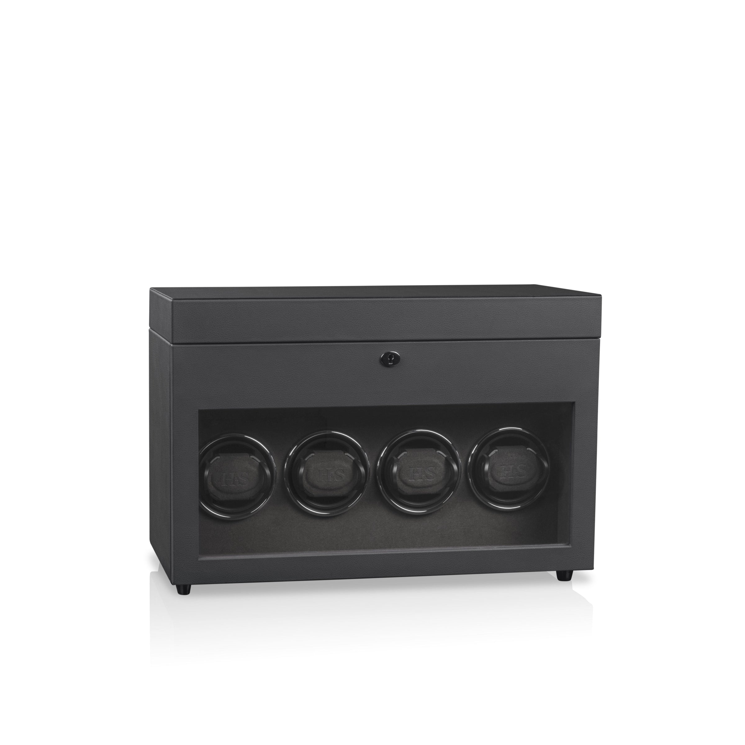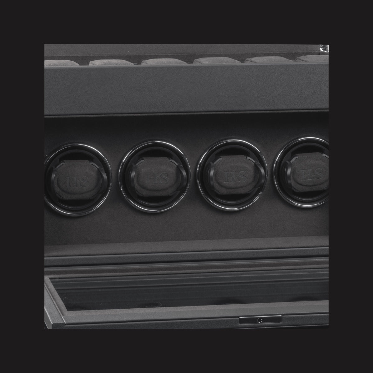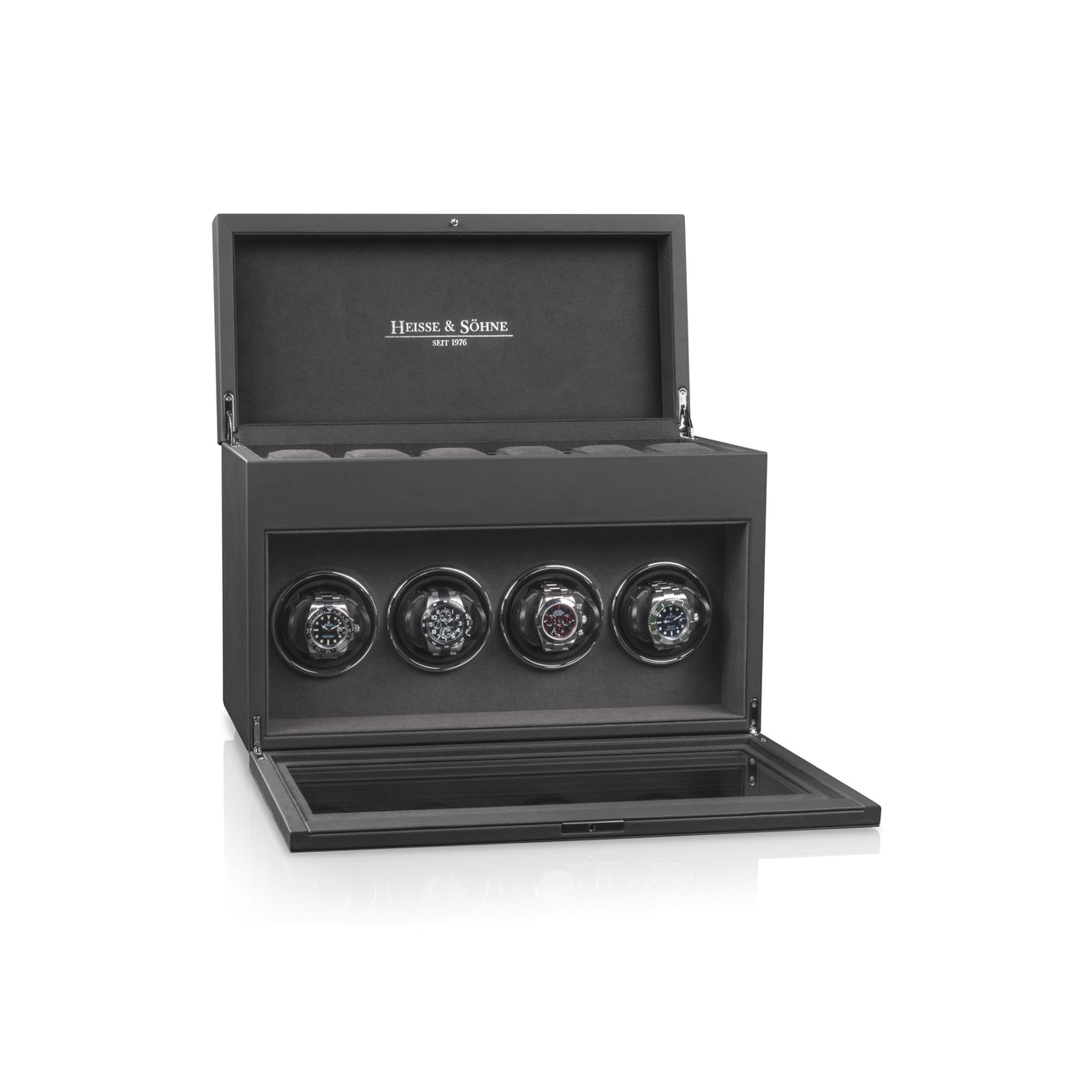 The design of the Vancouver series is both straightforward and functional. Depending on the selected version, up to eight automatic watches are gently rotated behind a lockable front. The additional shelf in the upper section of the watch winder allows you to store up to six additional watches. The soft watch cushions in the top compartment are fitted with chrome-plated guide pins on both sides to prevent the watches or watch cushions from slipping.