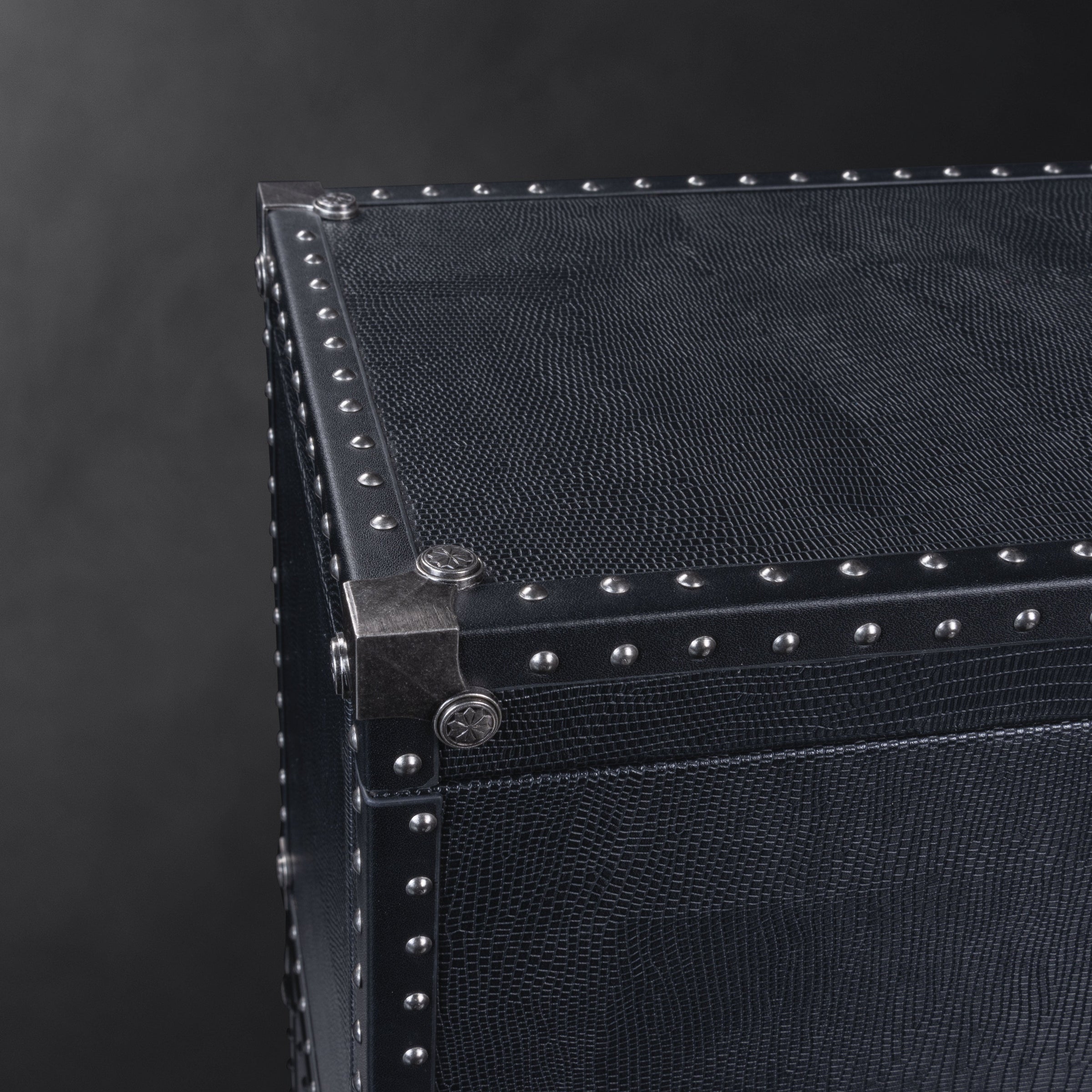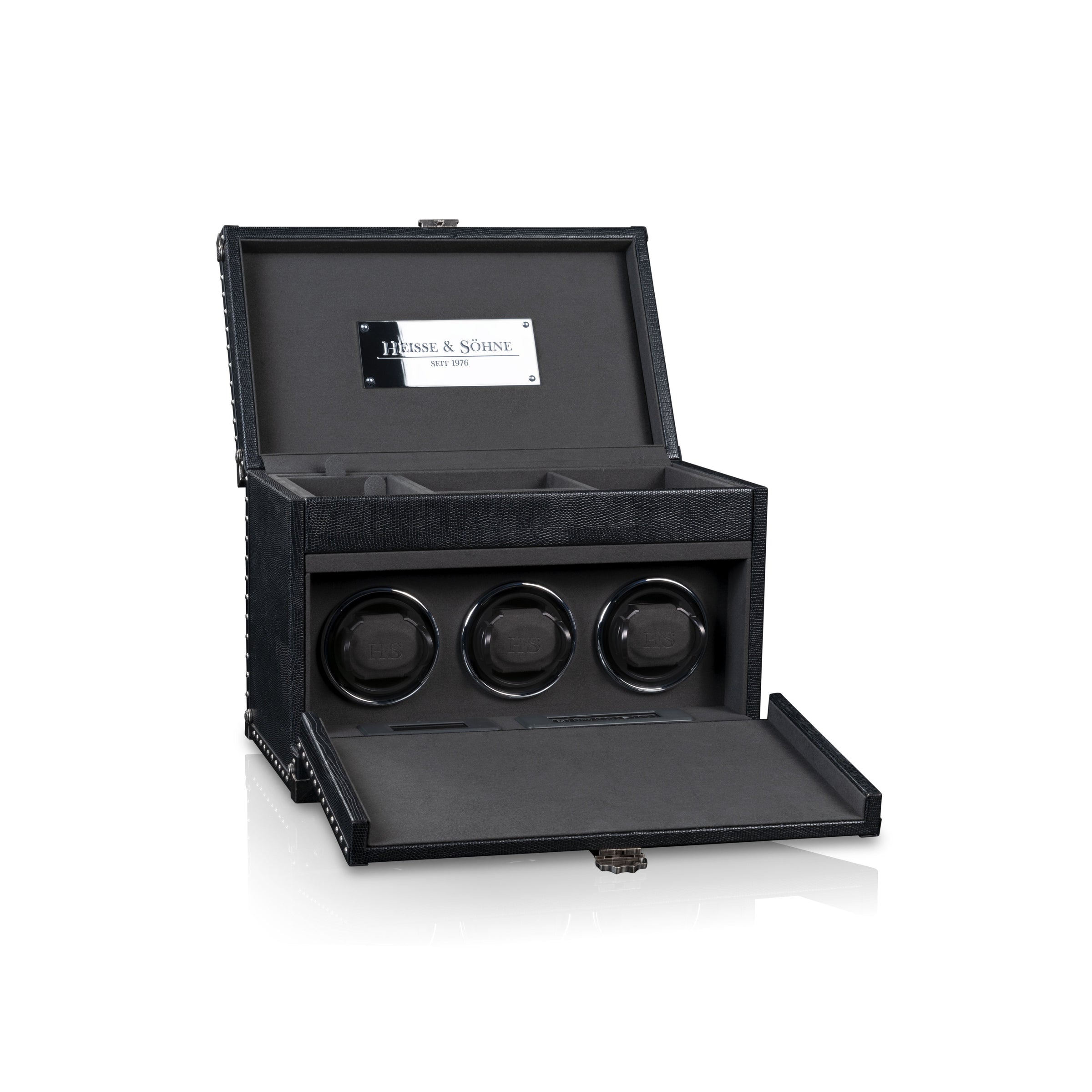 The Verne series, inspired by Victorian style and Steampunk design, combines luxurious aesthetics with advanced technology. The solid case, covered with vegan imitation leather and decorated by hand with rivets, offers space for three automatic watches. Additional jewelry and valuables can be stylishly stored in the top shelf. With technologies such as Premium-Drive, LCD-Control, Smart-Sleep and Interior-Light, the series guarantees a quiet and gentle winding as well as a perfect presentation.