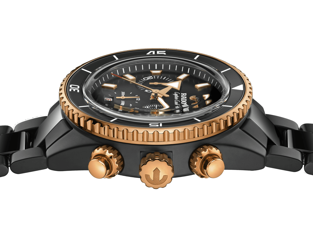 Precision forged through extreme engineering—the Captain Cook High-Tech Ceramic Chronograph is the result of uncompromising processes and material innovation. Born from pressure, heat, and technical mastery, its construction pushes the boundaries of what’s possible in modern watchmaking. The 43 mm monobloc case, crafted in matt black high-tech ceramic, is paired with a rose gold-coloured PVD-coated stainless steel turning bezel and a polished black ceramic insert, engraved with white Super-LumiNova® markers.