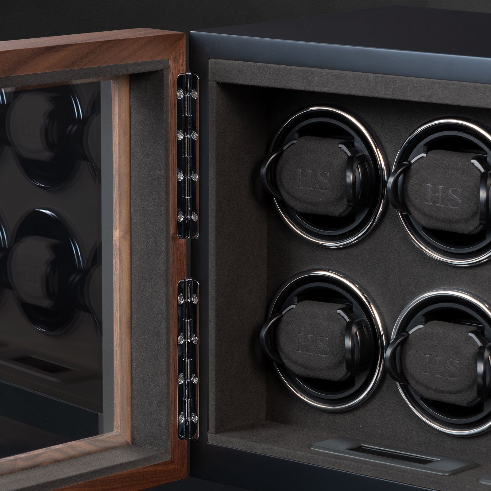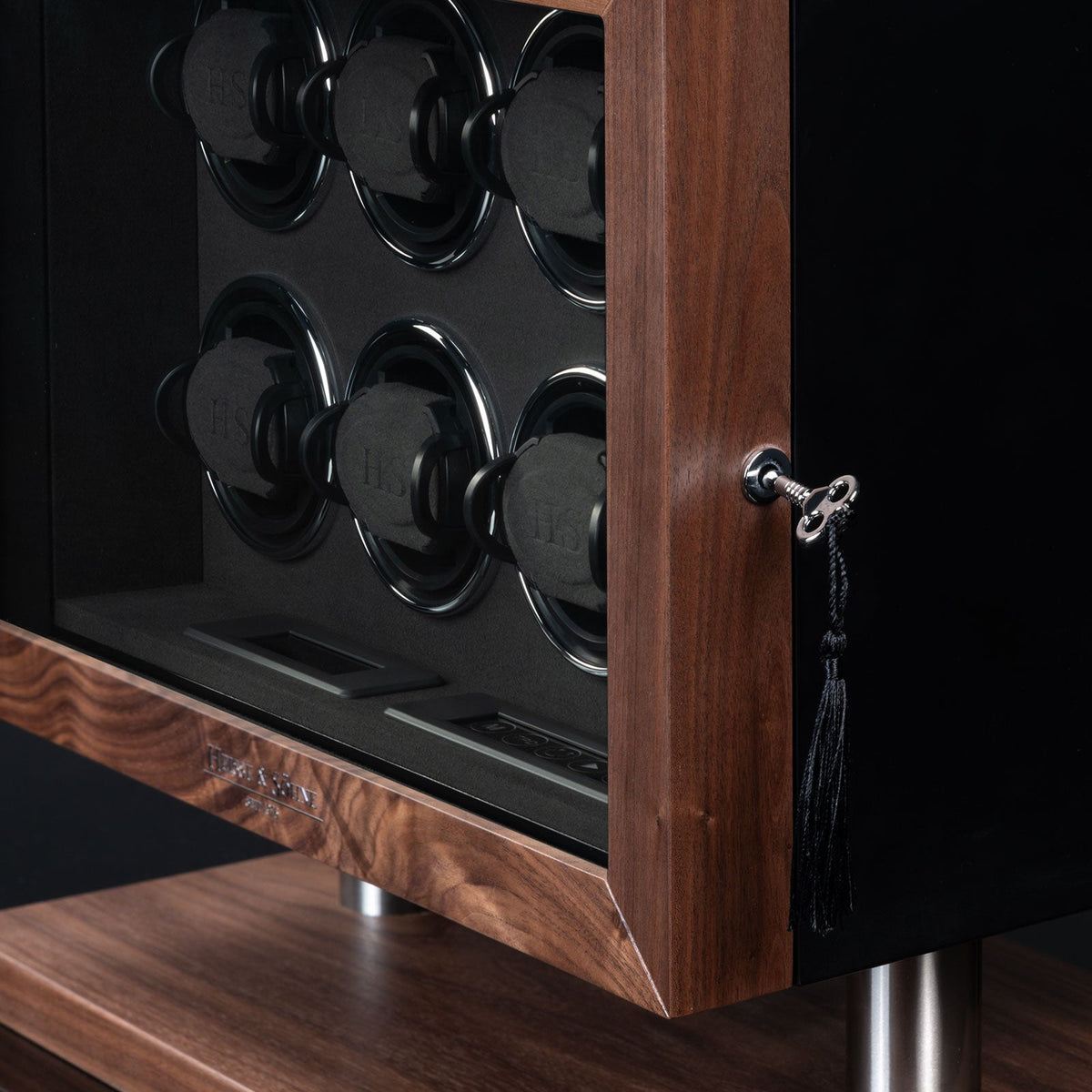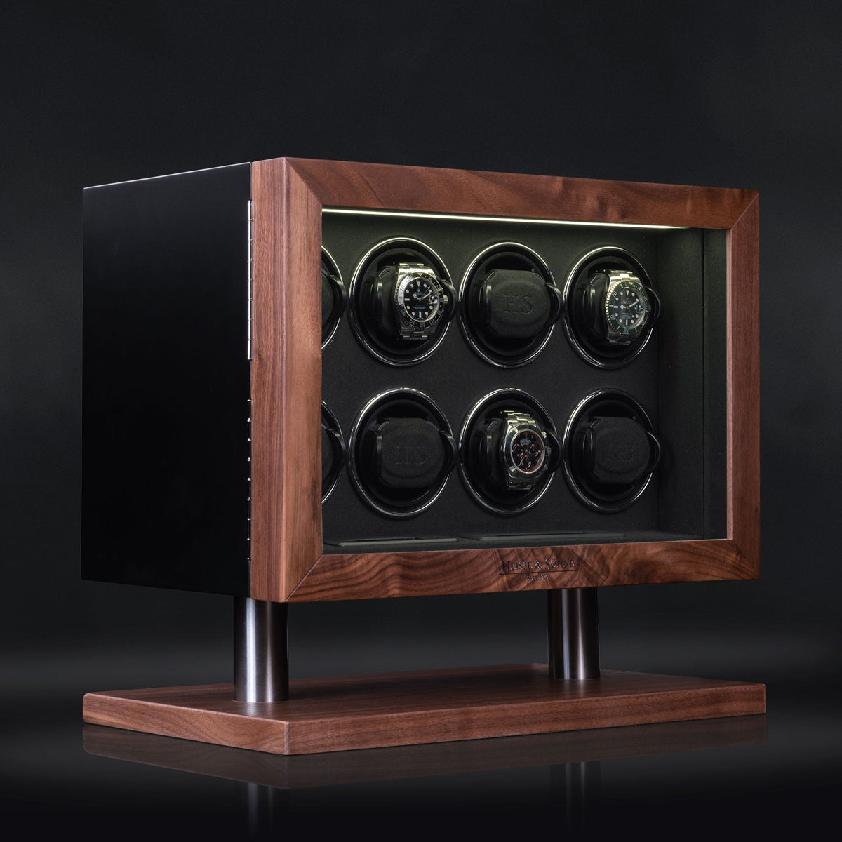 The ever-growing fascination with mechanical timepieces is leading to rapidly growing watch collections. The watch winders of the New York series are predestined for safe and stylish storage. The combination of American walnut and matte lacquer gives this series its simple elegance. The brushed and anodized aluminum applications in the base are highly expressive features of this series. The separately switchable interior lighting sets your watches perfectly in scene at any time of day or night. A lock protects the watches in the watch winder from unauthorized access.