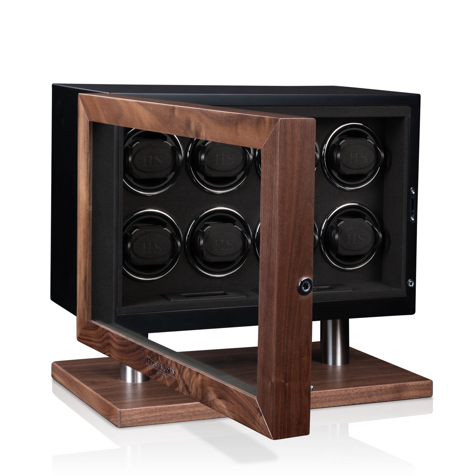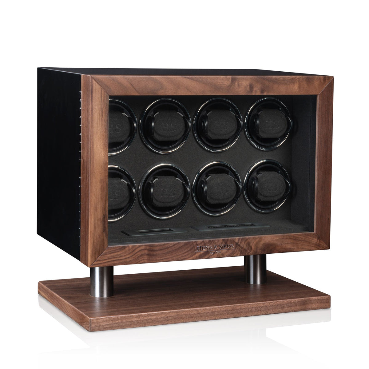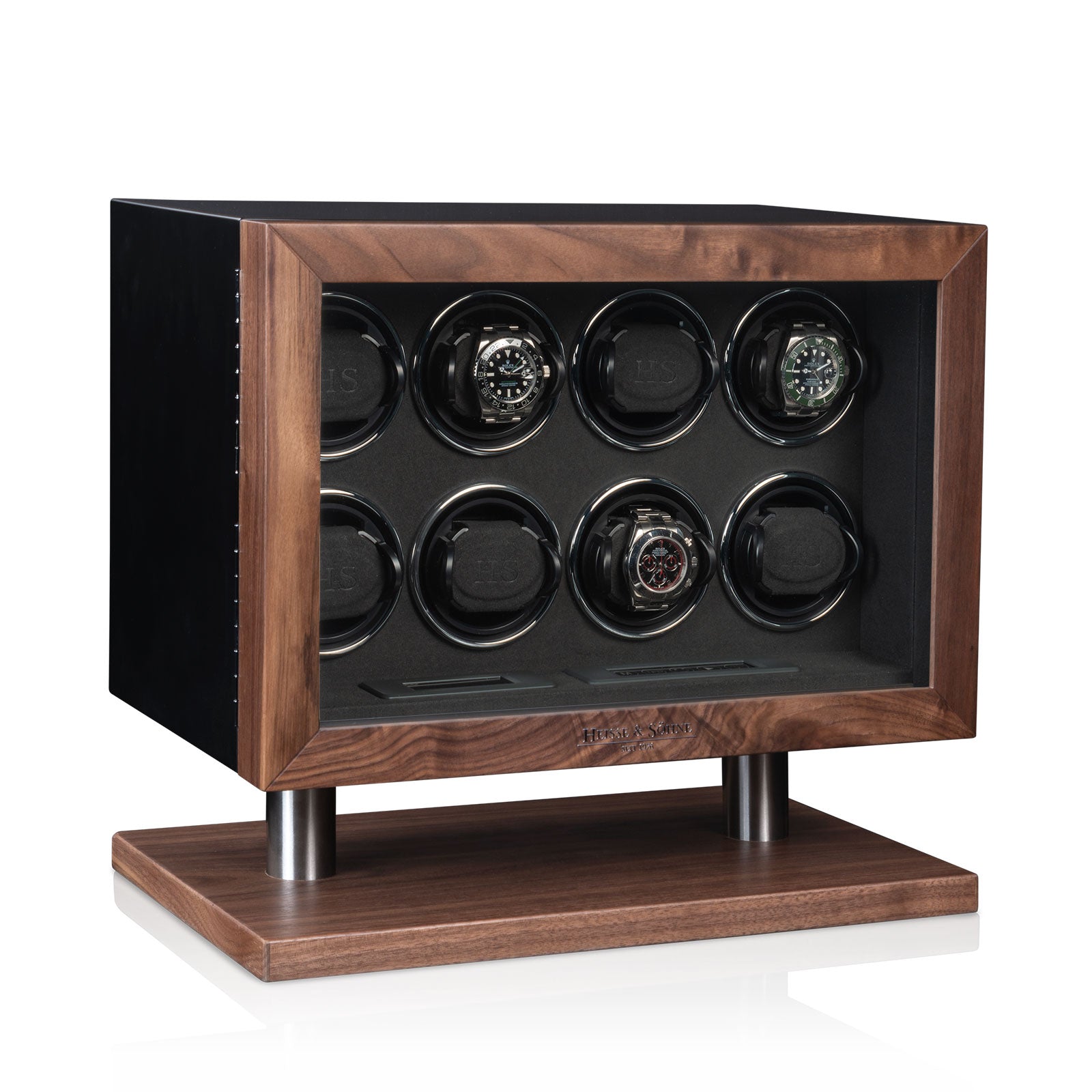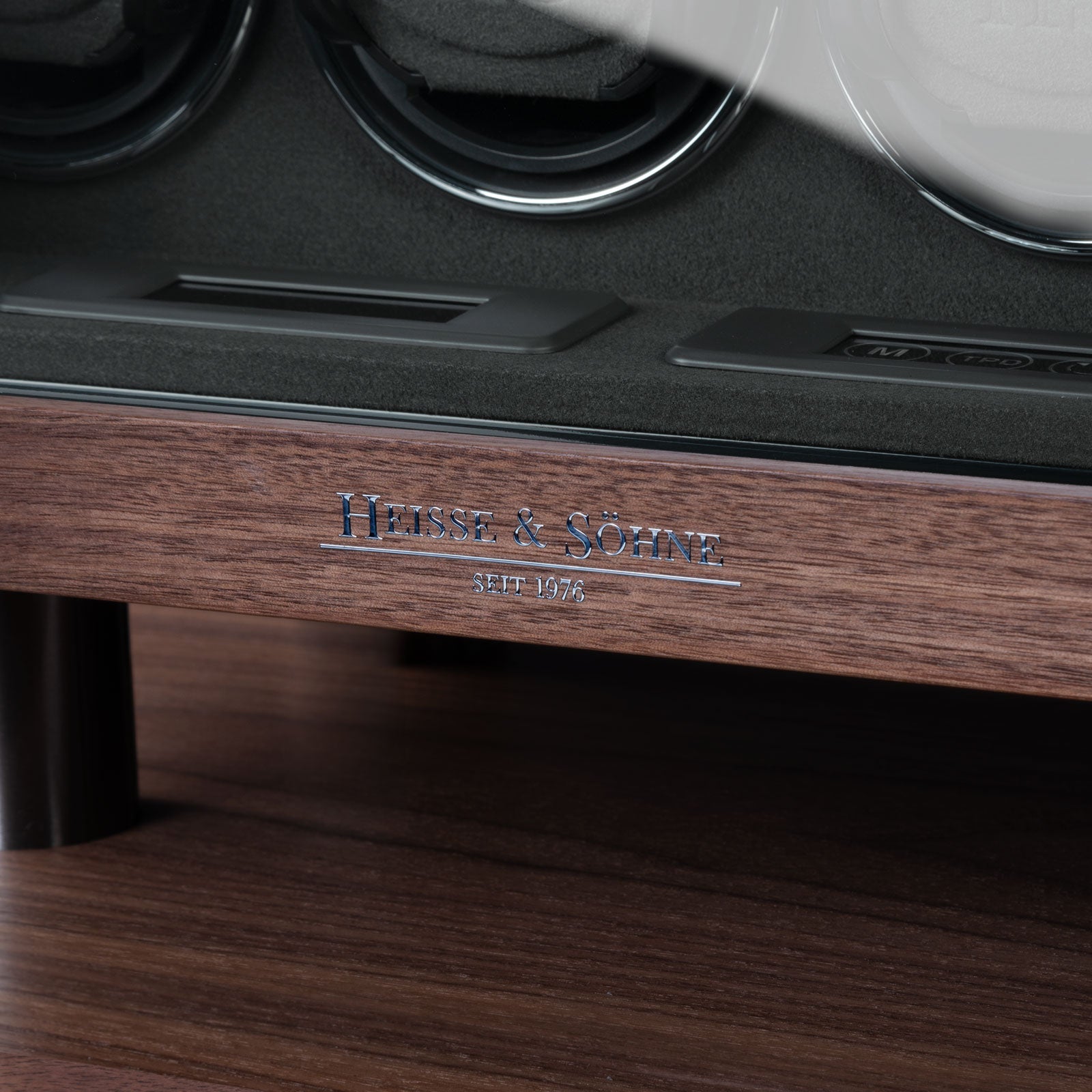 The ever-growing fascination with mechanical timepieces is leading to rapidly growing watch collections. The watch winders of the New York series are predestined for safe and stylish storage. The combination of American walnut and matte lacquer gives this series its simple elegance. The brushed and anodized aluminum applications in the base are highly expressive features of this series. The separately switchable interior lighting sets your watches perfectly in scene at any time of day or night. A lock protects the watches in the watch winder from unauthorized access.