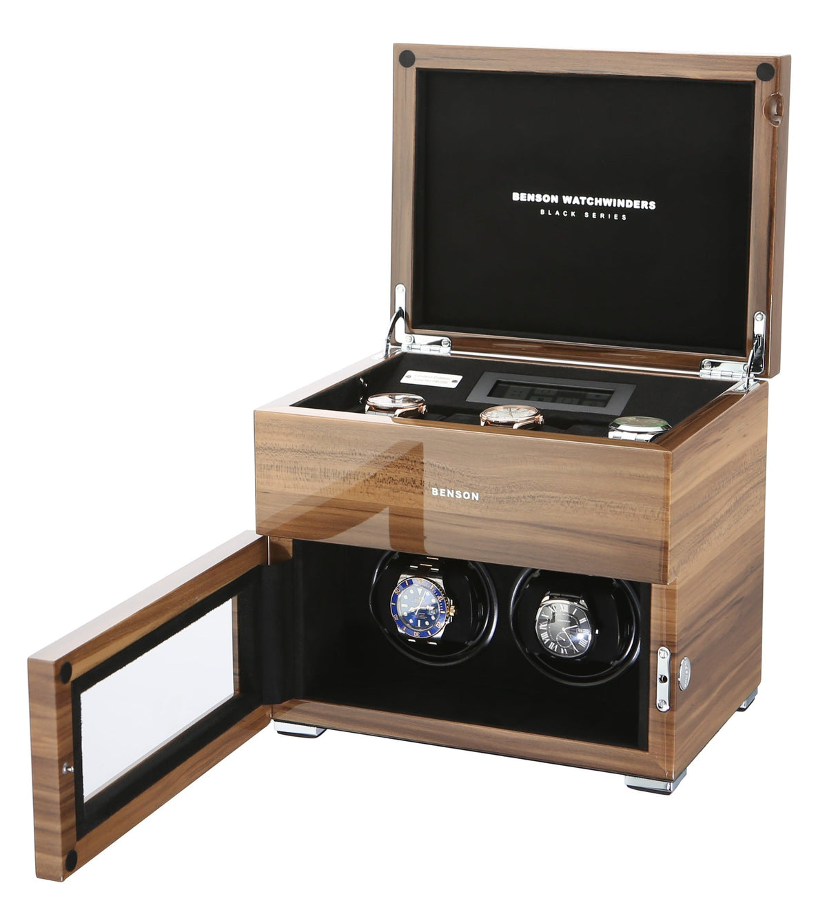 The new Benson Black Series represents the most luxurious line of watch winders Benson offers. This product combines the newest in watch winder technology with a stylish design and the highest quality finish. With extra storage for other watches, LED lighting, a soft-close cover, and an innovative touch screen, the Black Series offers both functionality and a quality design. Benson’s lacquered finish ensures a beautiful, rich color no matter which watch winder catches your fancy.